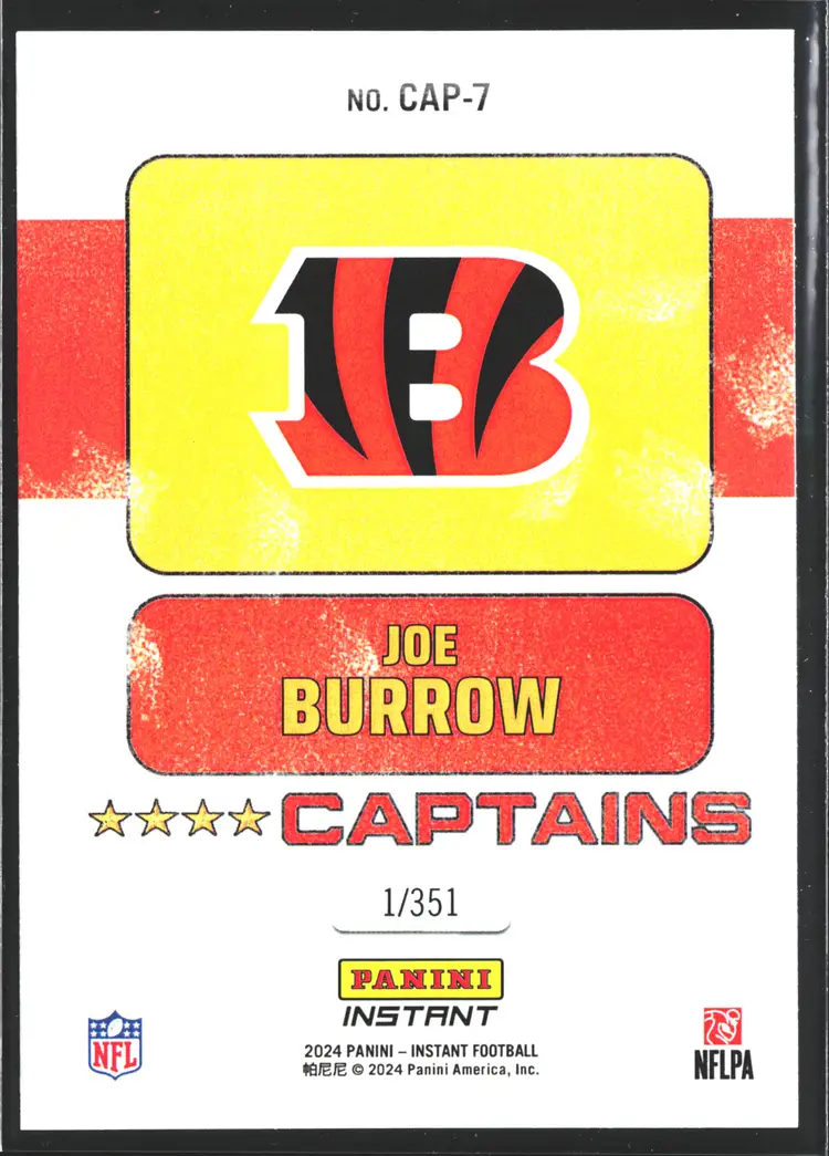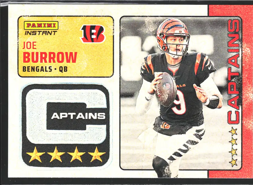 1st time buyer? Get $5 Off with code DISTRICT5 at checkout! Card as shown. All cards $20 and under ship PWE via lettertrackpro [https://www.letter-track.com/registerap.asp?AFID=8757] Season: 2024 Player/Athlete: Joe Burrow Team: Cincinnati Bengals Sport: Football Manufacturer: Panini Type: Sports Trading Card League: National Football League (NFL) Features: Limited Edition, Serial Numbered Set: 2024 Panini Instant NFL Parallel/Variety: Limited Autographed: No Year Manufactured: 2024 Vintage: No Graded: No Card Condition: Near Mint or Better Material: Card Stock Original/Licensed Reprint: Original Country/Region of Manufacture: United States