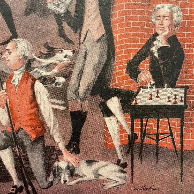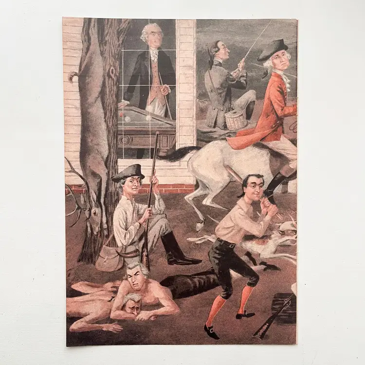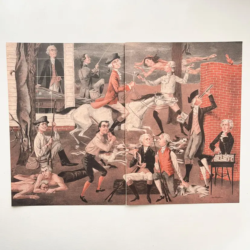 Joe Kaufman Art Print Founding Fathers American Revolution Sportsmen 1950s Framable Magazine Pages Taken from an old Sports Illustrated Magazine A true piece of Americana! Founding Fathers, American Revolution, George Washington Signed by Joe Kaufman (facsimile signature) Condition: The two inside edges are raw Measures 16-1/2 inches x 11-1/2 inches (2 Pages Combine to Make One) Packaged in a plastic sleeve inside a rigid envelope Visit my store to see more vintage ephemera, advertising, novelties, gifts, estate sale and yard sale finds https://district.net/u/finderspickerspaper SKU B16