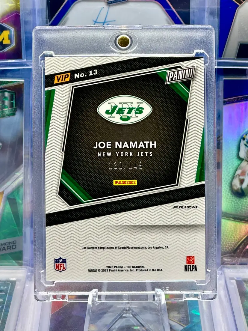 Joe Namath 2023 Panini VIP Blue Cracked Ice Prizm Serial Number Numbered #’d #d /149 Refractor Prizm Holo SP Short Print Insert Parallel Alabama Crimson Roll Tide New York Jets HOF Hall of Fame QB Quarterback Offense Offensive Player Rare NFL Football Card