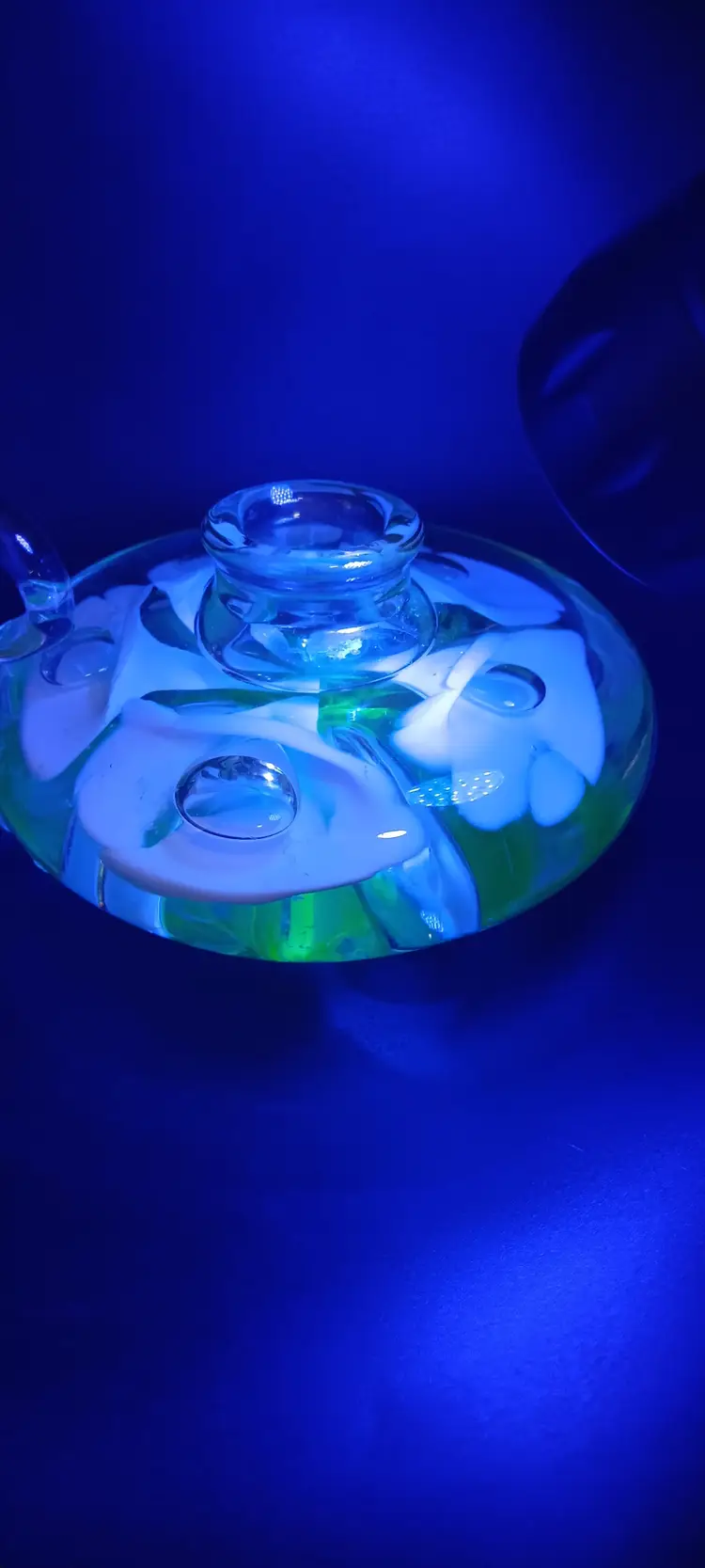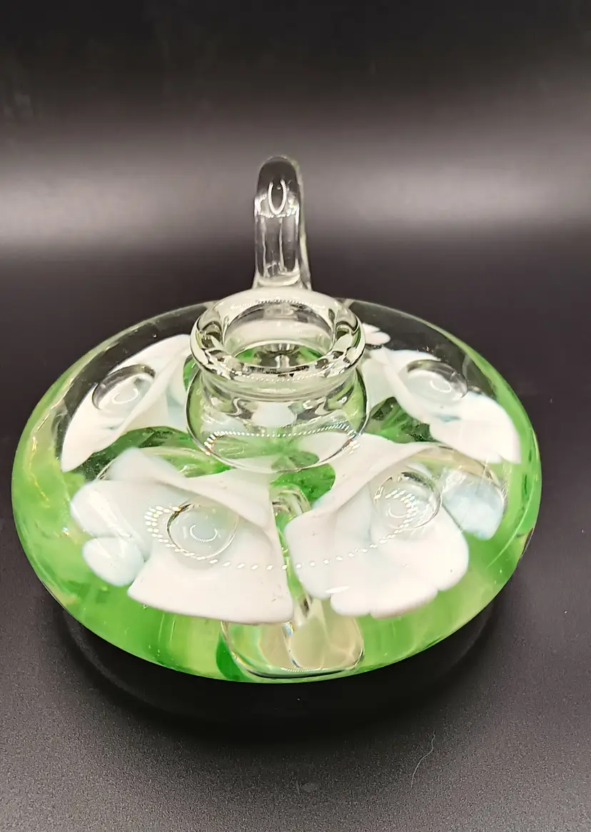 Stunning piece of blown glass. It does function as a paperweight and candleholder. Excellent condition. The green does glow on the bottom. This art Glass piece has controlled bubbles with white flowers and an applied handle. Measures 4" wide 5" to the handle 1.5" tall