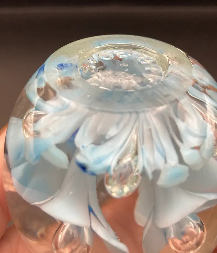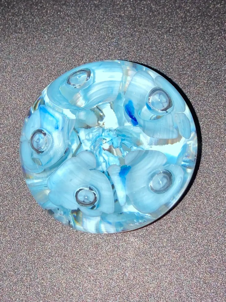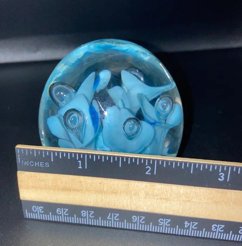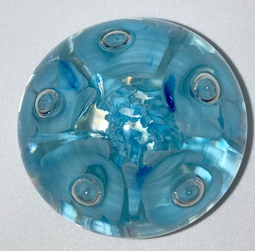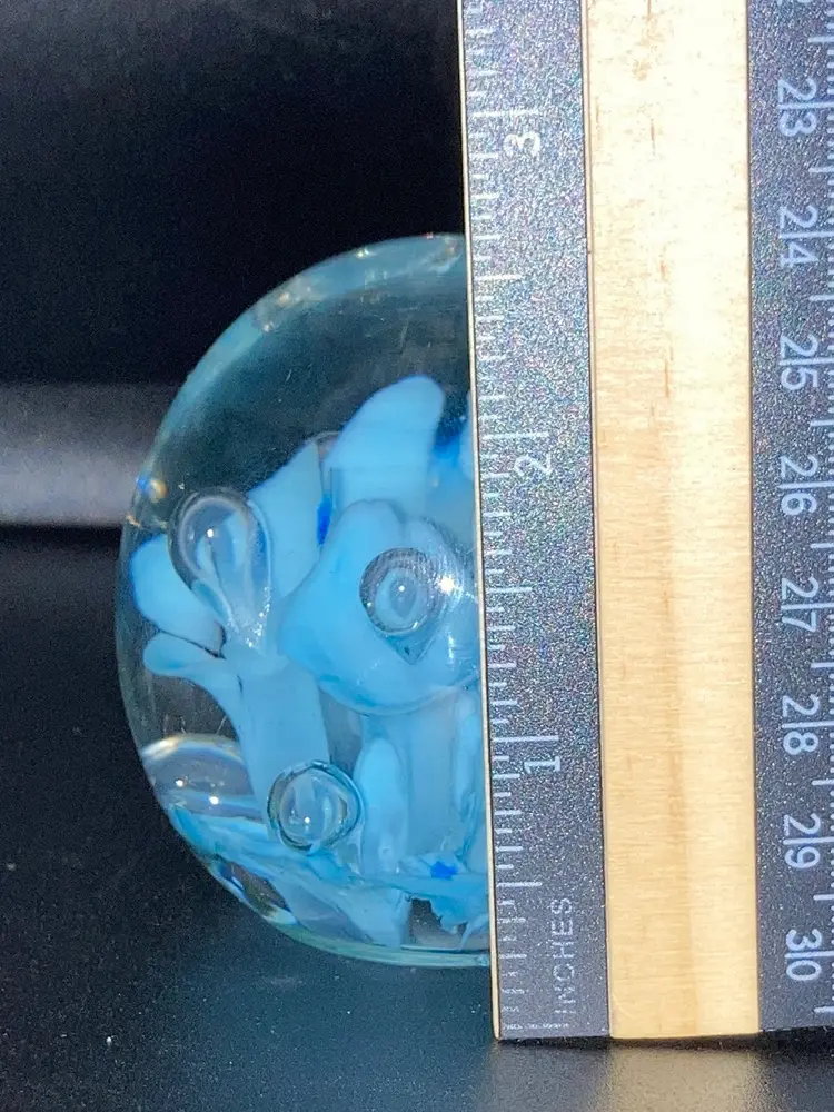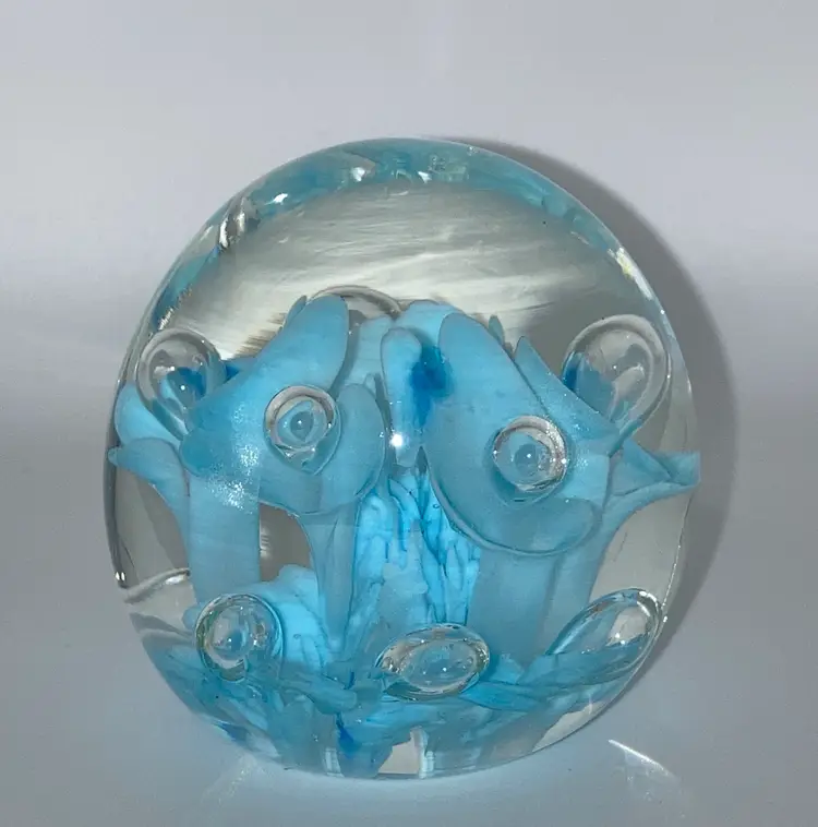Joe St Clair Beautiful Blue Trumpets With Controlled Bubbles Paperweight! 2 1/2” Tall 2 1/4” Diameter! No Damage. NEW to District? Enter code Michel42 into your wallet prior to your first purchase and save $5 off of $10 or more! Happy Hunting! Thank you for checking out my items! Give me a Follow and I'll Follow you back! I do combine shipping and refund for any overages!