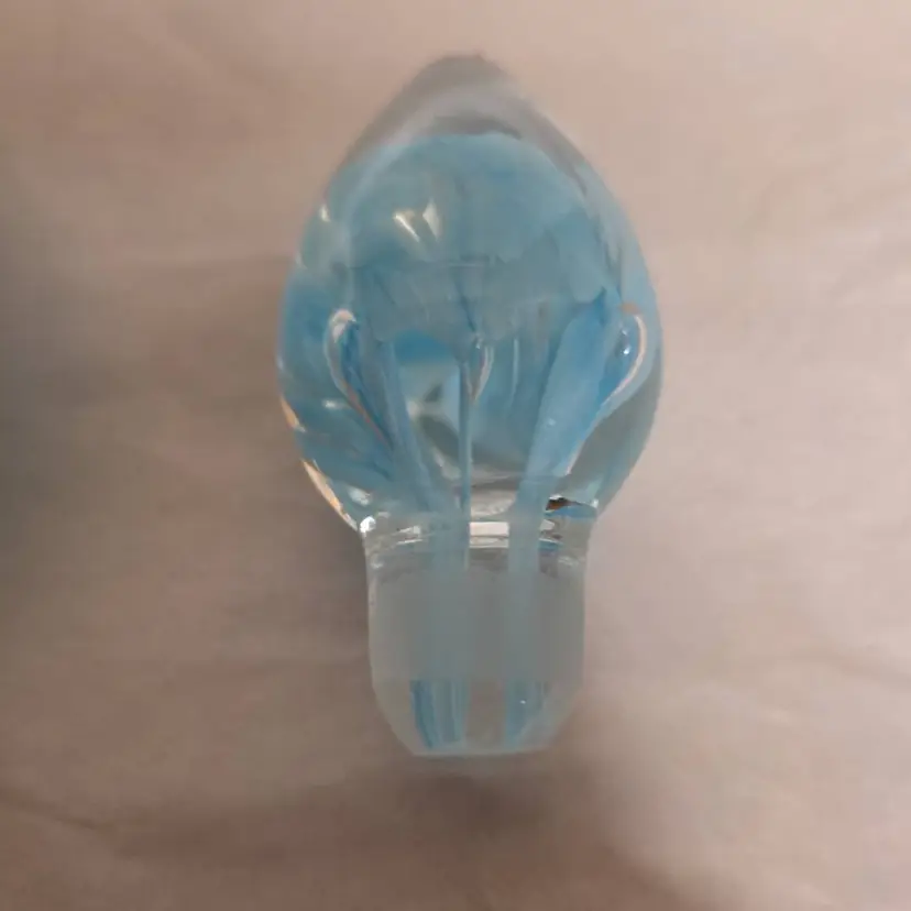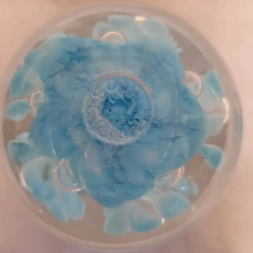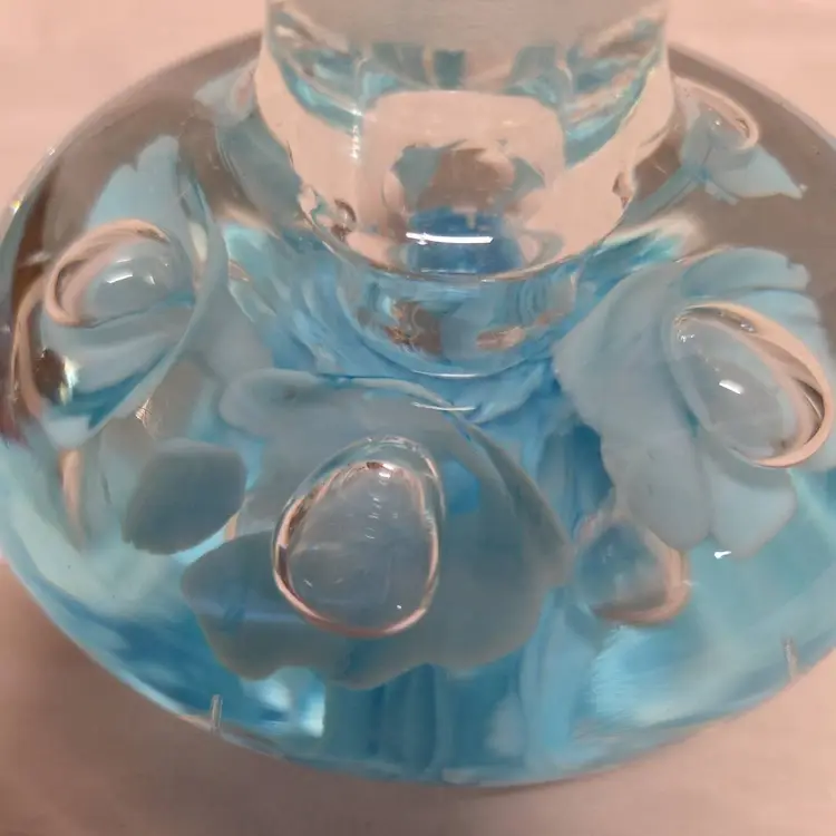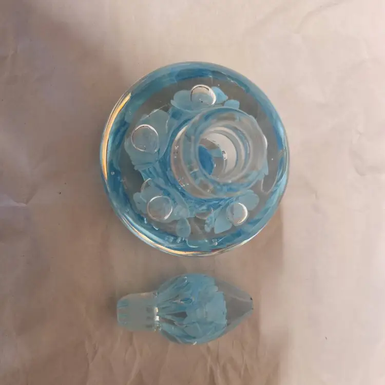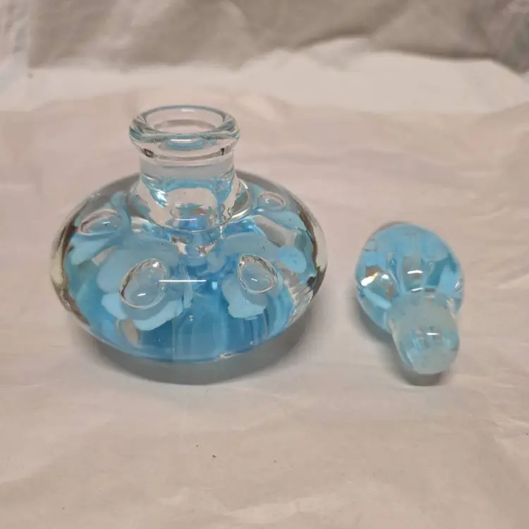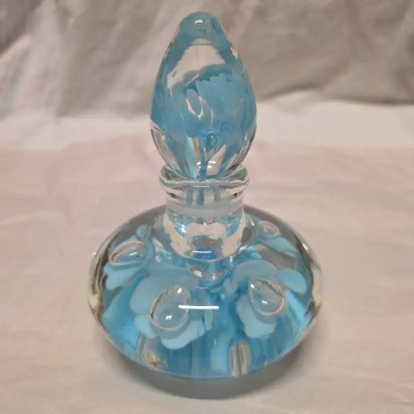 This Joe St. Clair Perfume Bottle is a handmade, hand-blown art glass piece featuring beautiful blue flowers and bubbles, making it not only a functional perfume bottle but also a decorative piece. Made in the United States by Joe St. Clair, this 6-inch tall bottle can also be used as a paperweight. Stopper included! This a unique and collectible item perfect for those with a love for artisanal pieces and glassware.