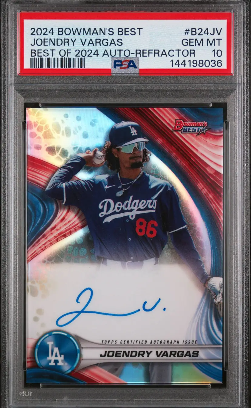Snag this Joendry Vargas Auto-Refractor from the 2024 Bowman's Best series, graded PSA 10. A gem for any Dodgers fan or card collector.