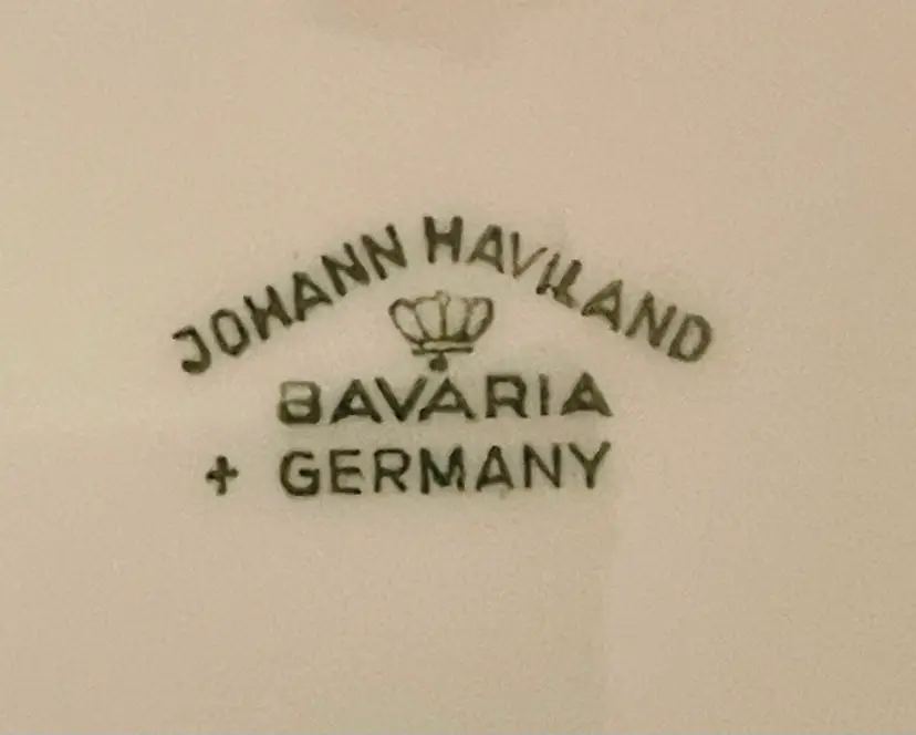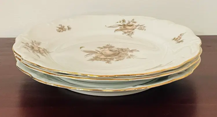 Details: • Maker: Johann Haviland • Origin: Bavaria, Germany • Diameter: approx. 8.5 inches • Set of 3 plates • Porcelain with gold trim • Scalloped edge • Vintage (mid-20th century)