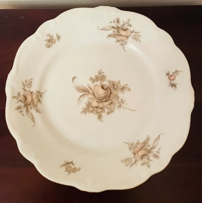 Vintage Johann Haviland porcelain salad plates made in Bavaria, Germany, featuring a soft beige rose floral pattern with scalloped edges and gold trim.