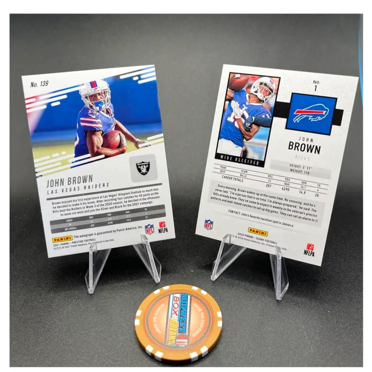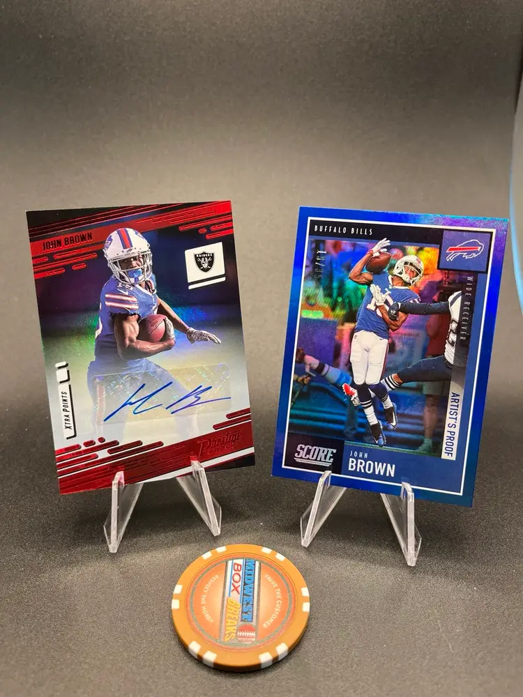 Two John Brown cards. 2021 Prestige auto 2020 Score #19/35. Lower corner is soft. Buffalo bills.