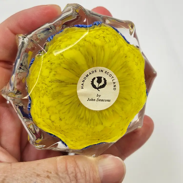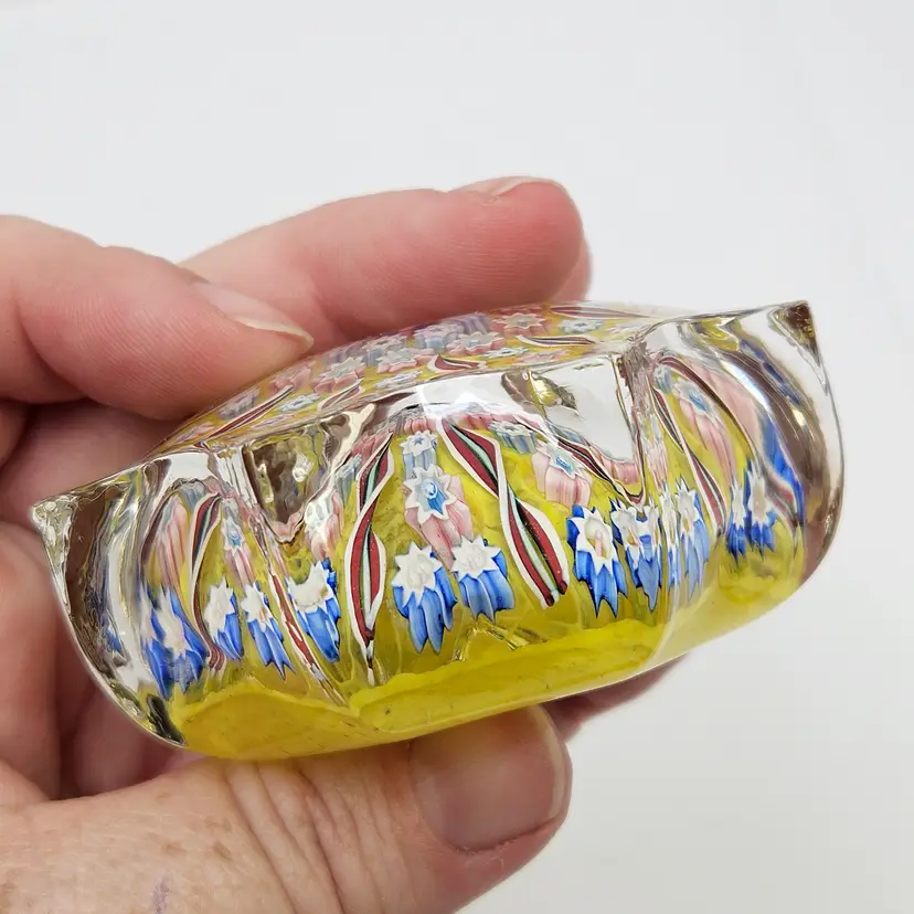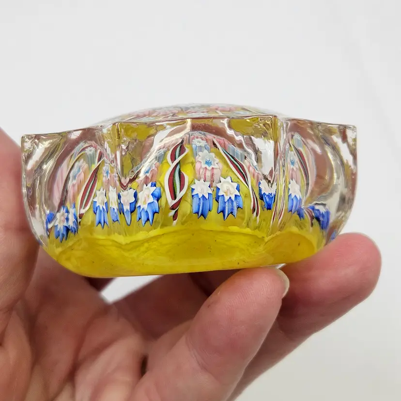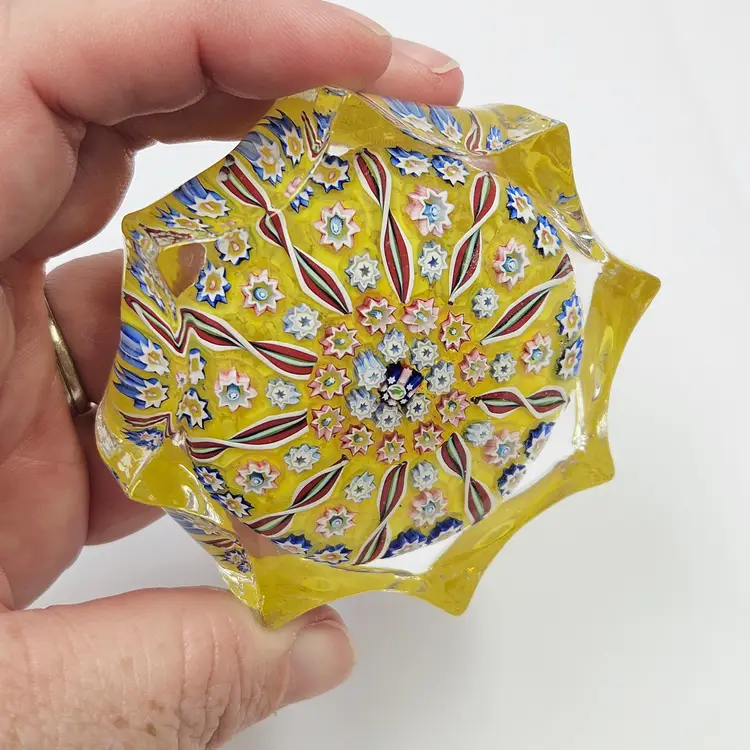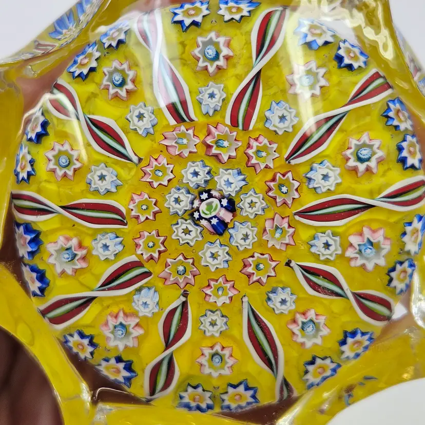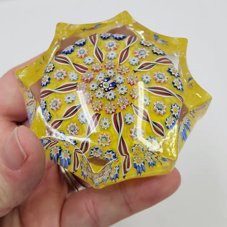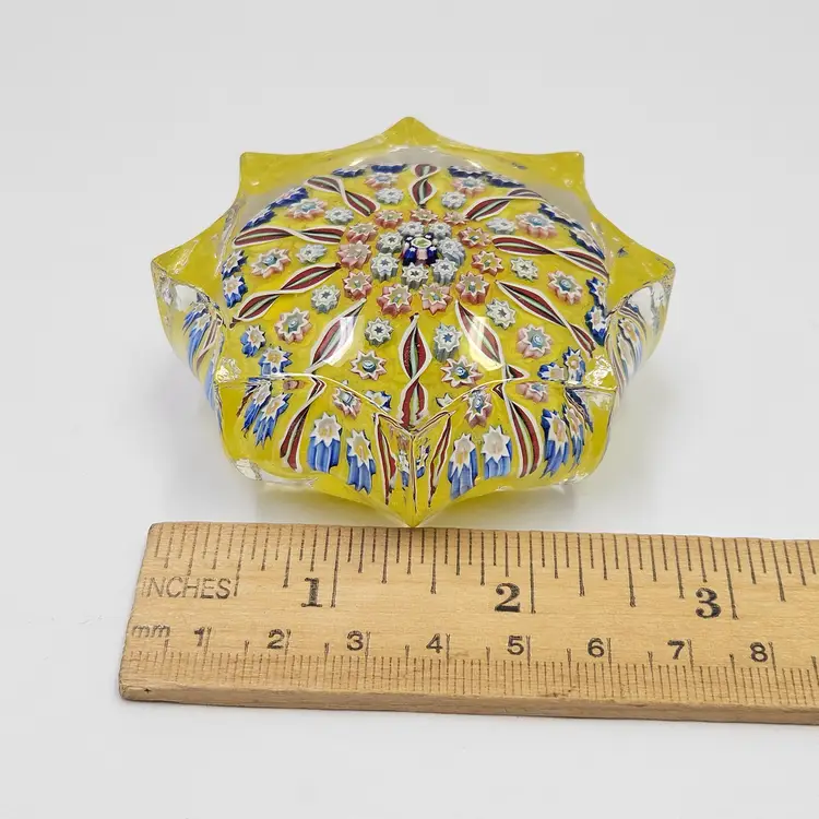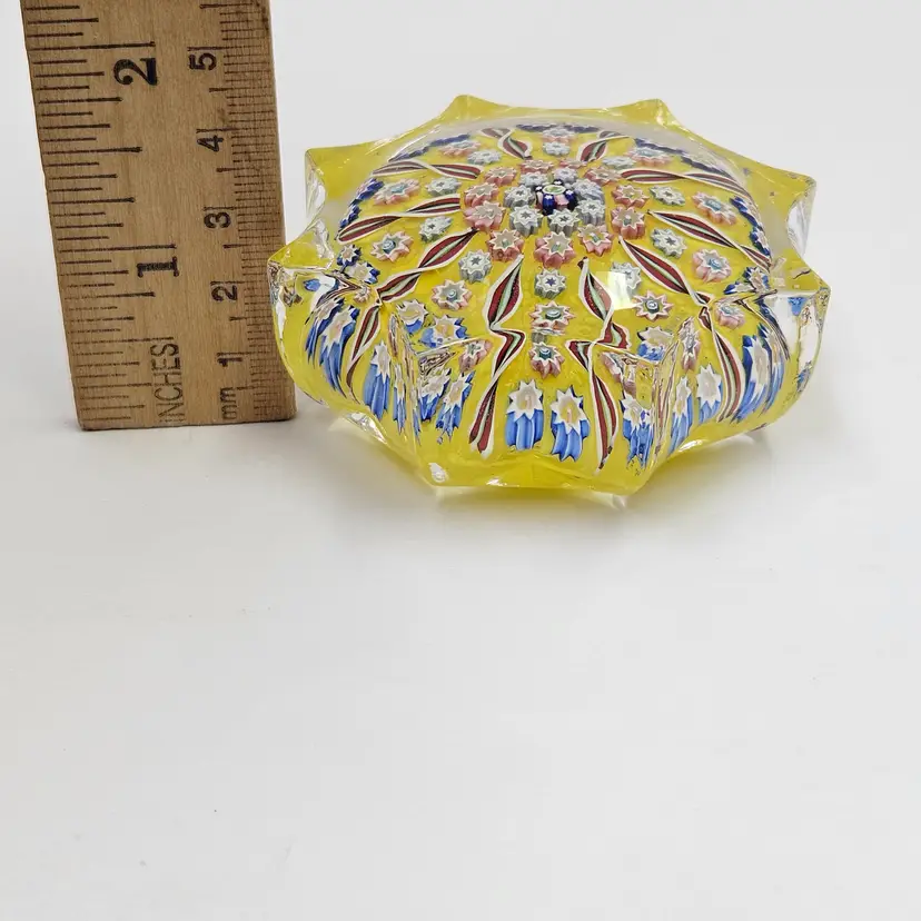 Stunning John Deacons glass paperweight, yellow star shaped, ribbon cane & millefiori, 1.25"x3", No damage.