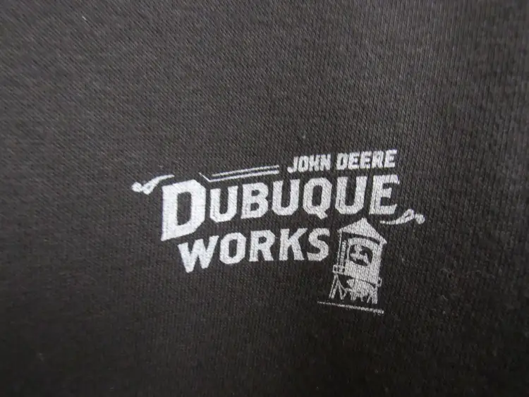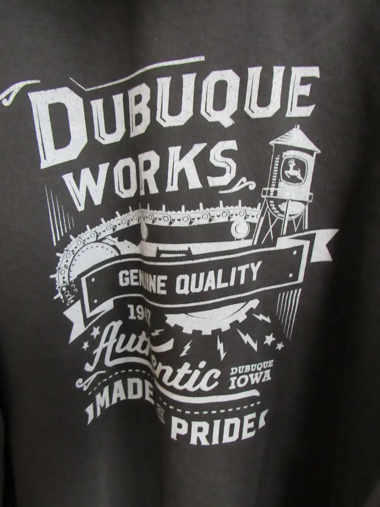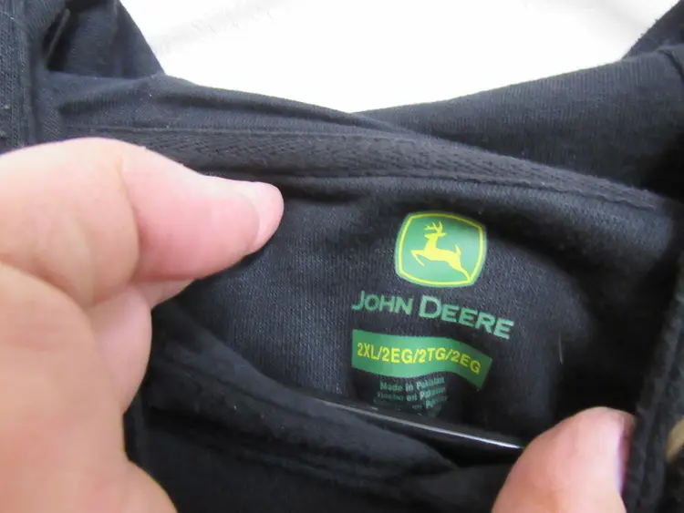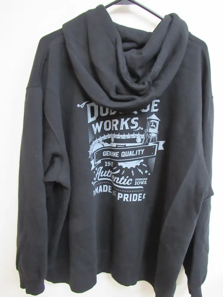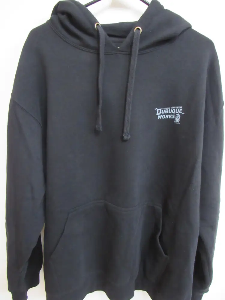 John Deere Dubuque Works black fleece hooded sweatshirt. Size 2XL. 28" armpit to armpit and 28" top of collar to bottom of hem. Nice condition. 4410