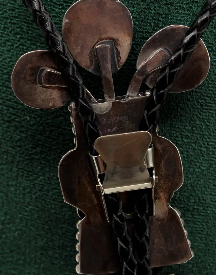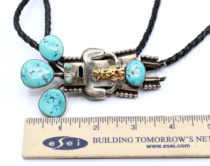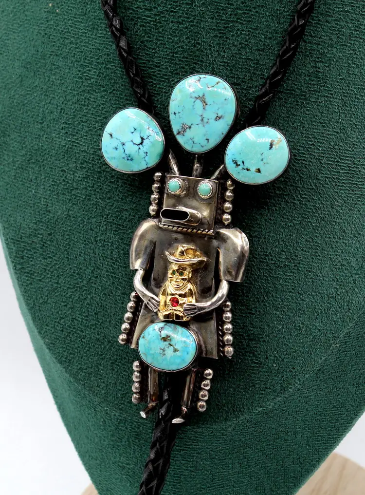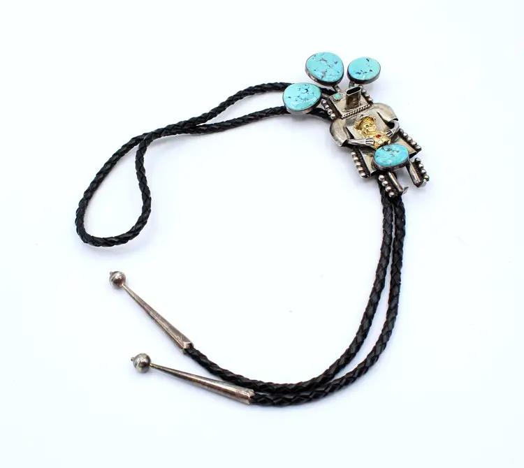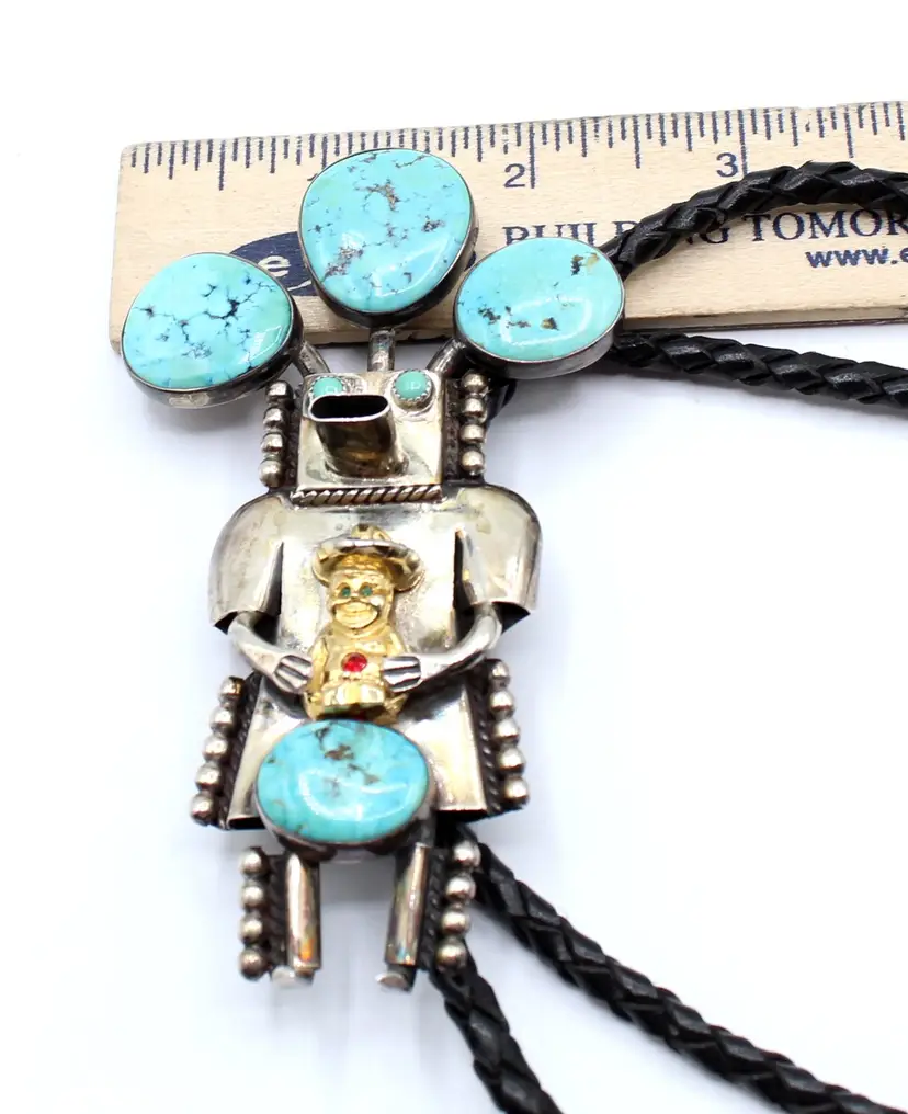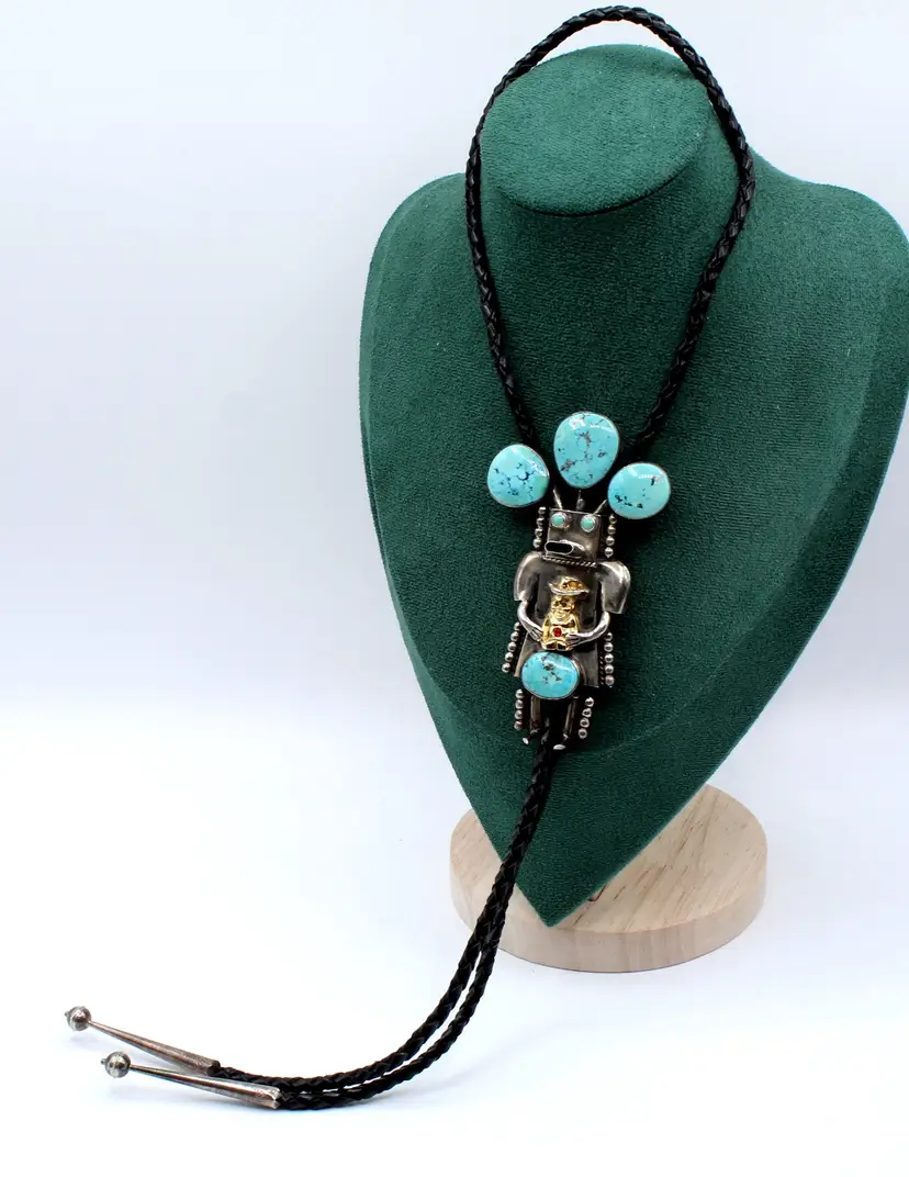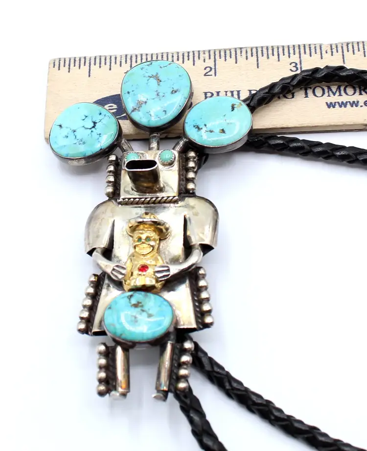 Fantastic Cool Kachina with 6 cabochon turquoise stones set in smooth and sawtooth bezels, dressed in dots and a cowboy embellished with rhinestones. Leather cord seems new as it is a bit stiff, finished with sterling tips. Kachina measures 4" x 2.25". Stamped John Larson Sterling.