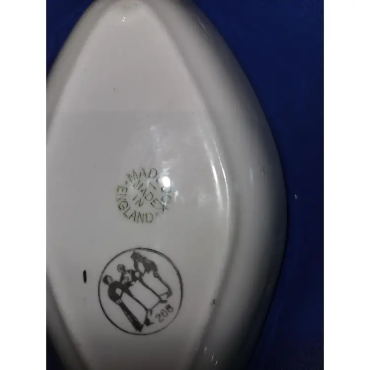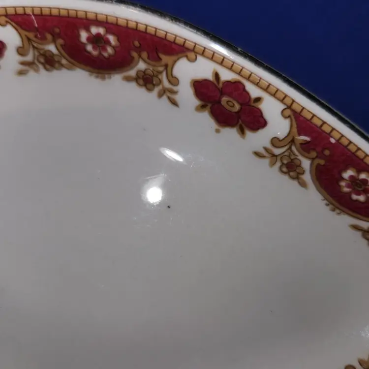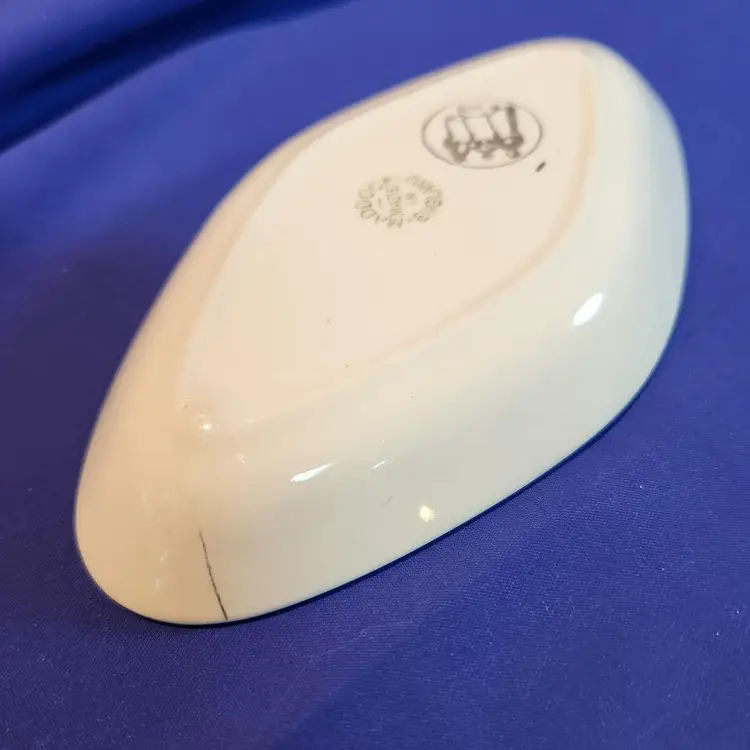 John Maddox Diamond Shape Trinket Dish Made in England Red flower encircle the dish with gold tone trim Measures 5 3/4 inches by 3 1/4 inches There are 2 marks (see last 2 pictures)...one is a boo boo in gold paint (brush slipped?) and second is a black dot in dish...both manufacturer mistake? Otherwise in good condition