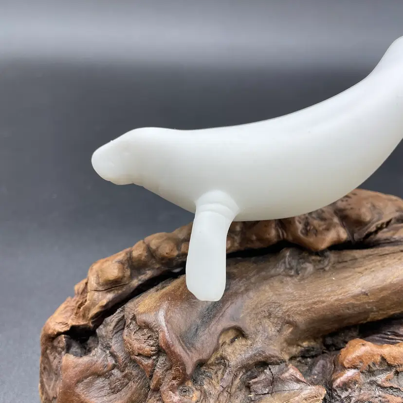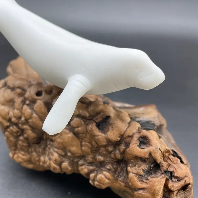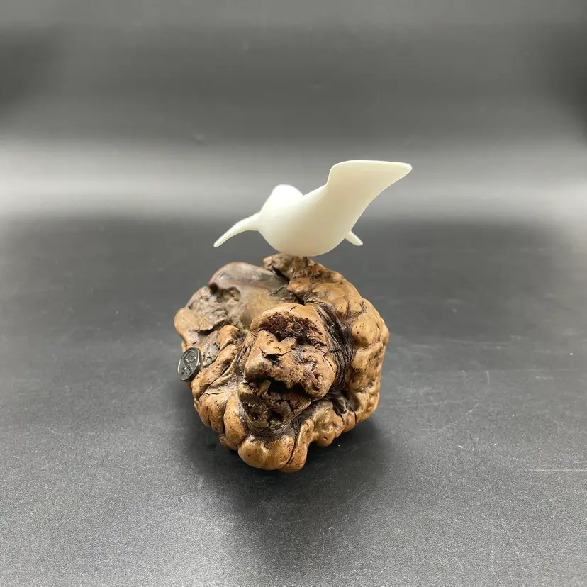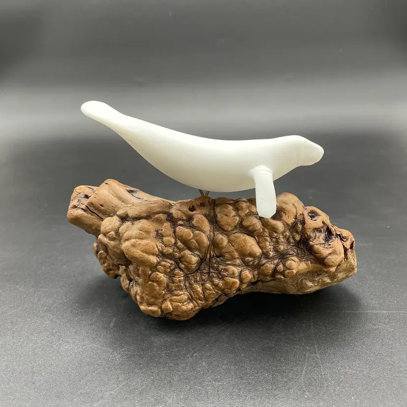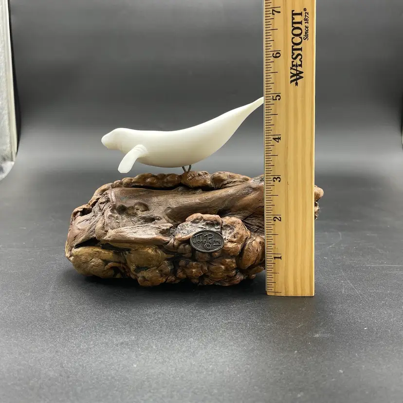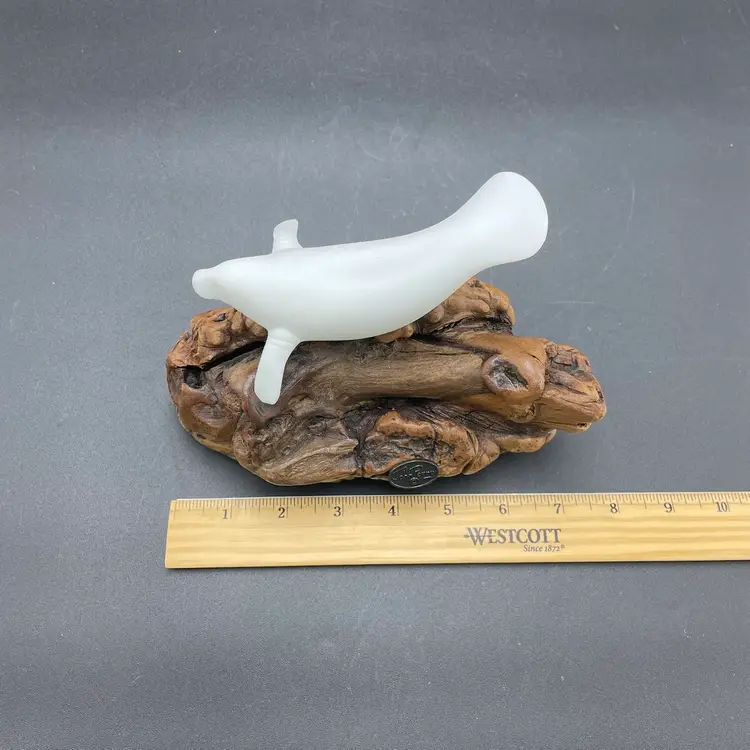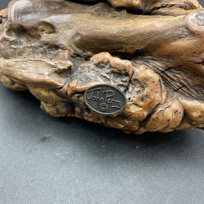 This is a vintage manatee on burl wood sculpture by John Perry. Measures approximately 5" tall x 8" long. There is minimal scuffing on the back side as shown in pictures. No other major flaws.