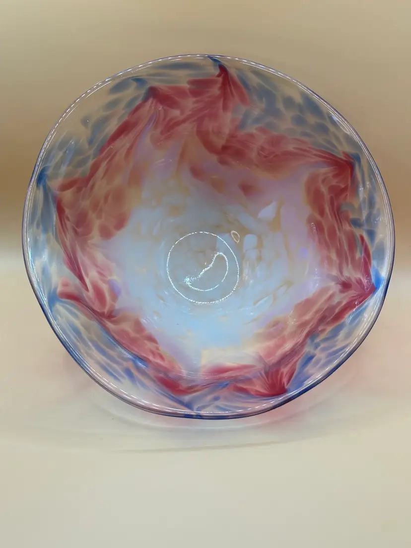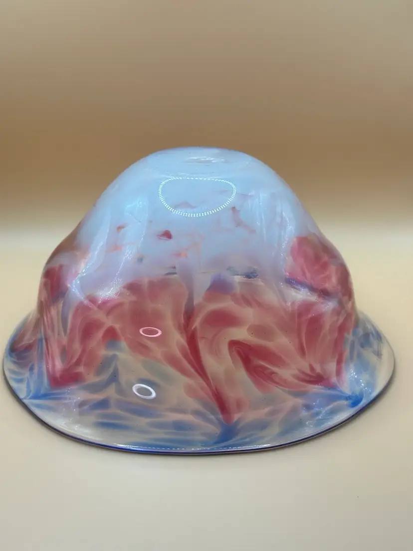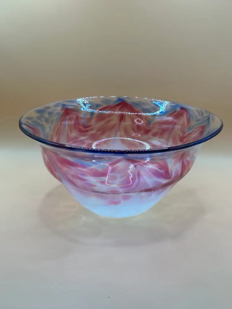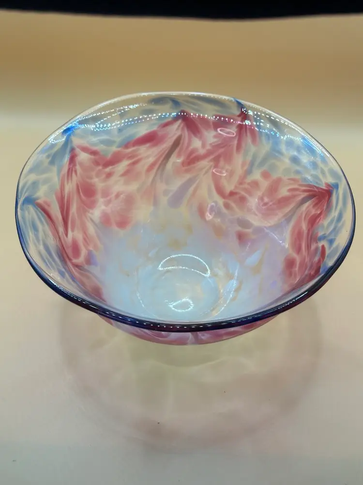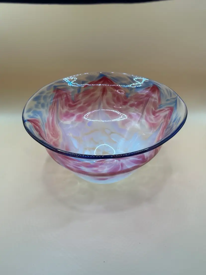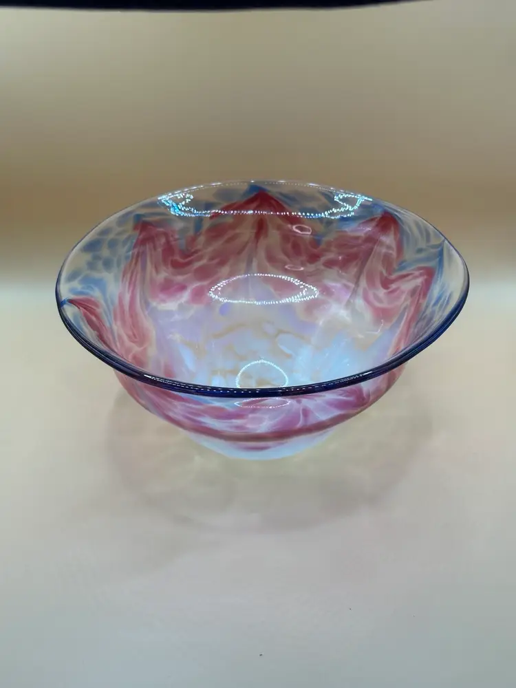 This unique art glass bowl by John Sullivan is a stunning piece that will add a touch of elegance to any collection. Handmade in the United States in 1997, this original piece features a beautiful abstract pattern with vibrant multicolor hues. Measuring 7.5 inches in length and width and 3 inches in height, this one-of-a-kind bowl is a true gem of late 20th-century art glass. No chips or cracks.