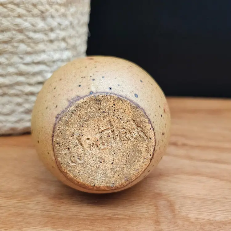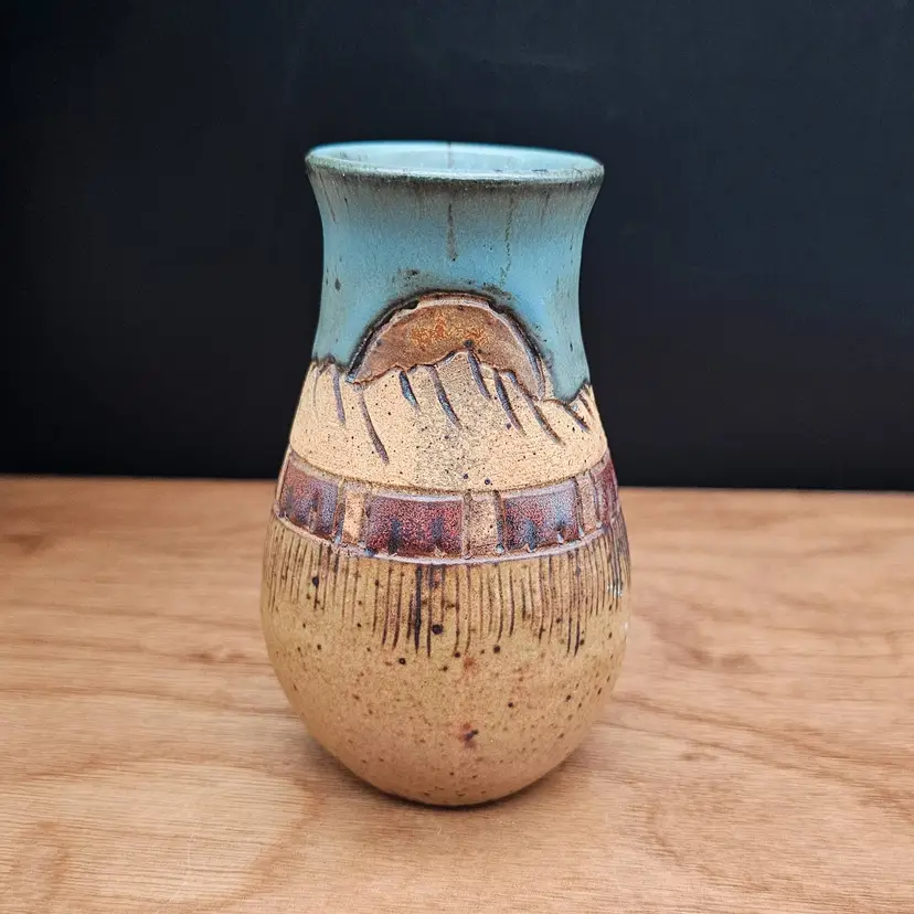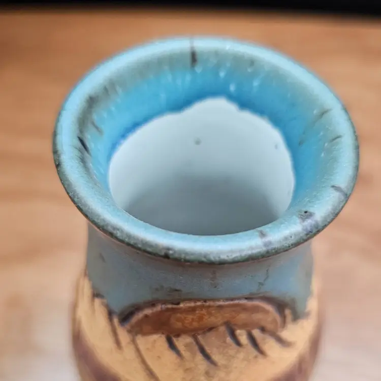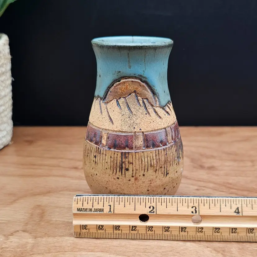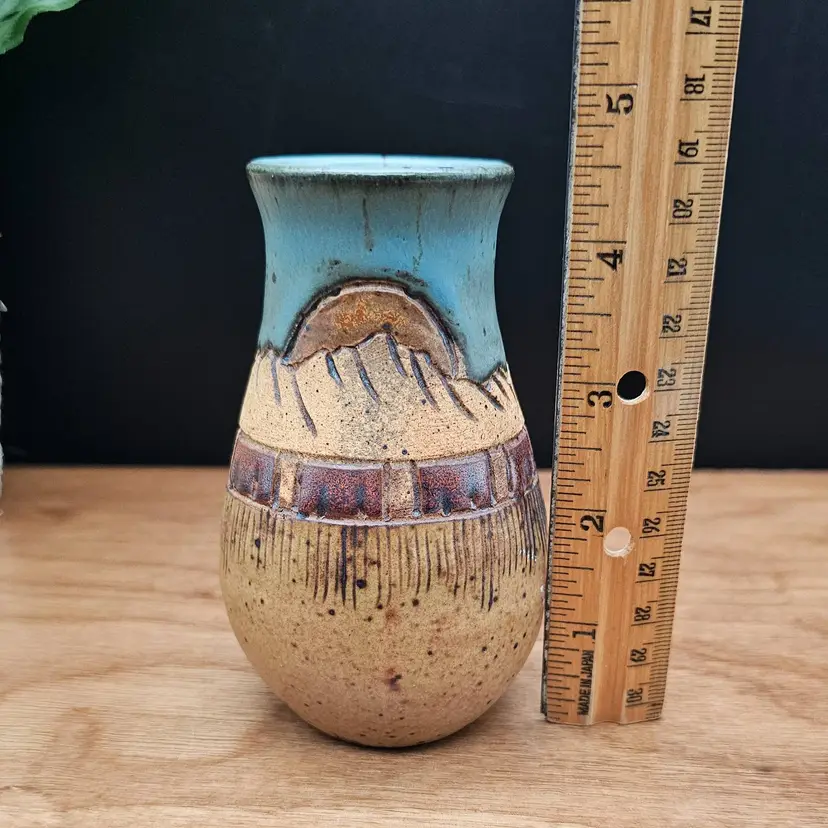 This handcrafted vase is signed Winterhawk and measures 2-3/4" wide x 4-1/2" tall. It is in excellent condition with no chips or cracks.