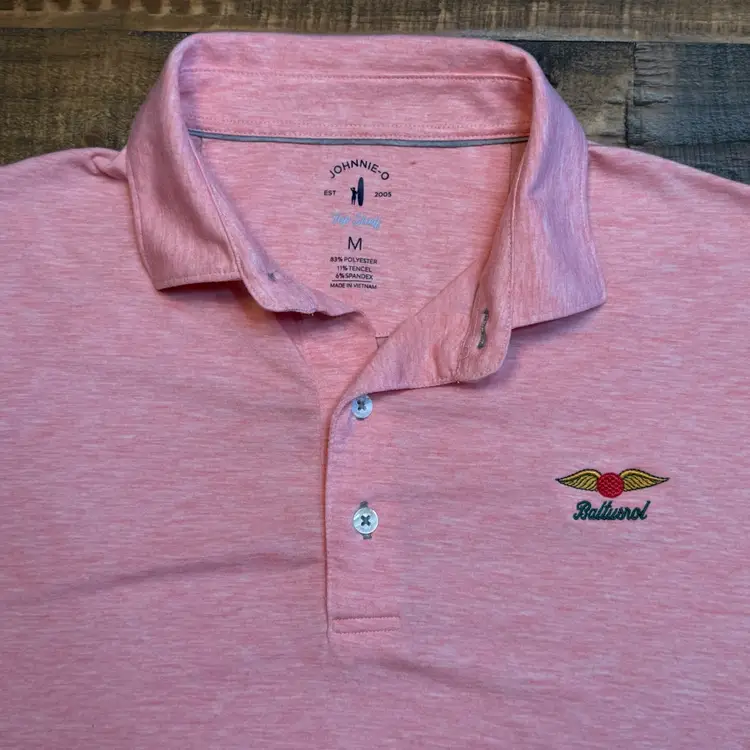 The Johnnie-O Baltusrol Top Shelf Performance Polo Shirt is a stylish and functional piece of men's clothing designed for travel, activewear, and casual occasions. Made from a knit cotton fabric, this polo features a collared neckline, button closure, and embroidered logo accents. It is a solid pink color with a modern sports theme, making it perfect for a golfer looking for a comfortable and breathable shirt to wear during their favorite activities. The shirt is quick-dry, moisture-wicking, and suitable for all seasons, ensuring that you stay comfortable and stylish no matter what the weather is like.