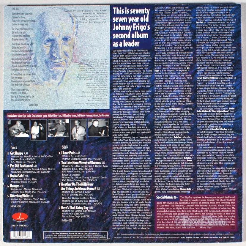 Debut of a Legend, by Johnny Frigo, is his definitive set, even though he was 77 at the time. With a good supporting cast (guitarist Gene Bertoncini, Bob Kindred on tenor and clarinet, pianist Joe Vito, bassist Michael Moore, and drummer Bill Goodwin), Frigo mostly explores standards, plus two of his originals. The music, falling between swing and bop, is superior straight-ahead jazz; among the highlights are Get Happy, Bow Jest, Jitterbug Waltz, and Jeannine. Frigo's sudden prominence in his '70s (considering he spent most of his career as a bassist) was as unlikely and welcome an event as trumpeter Doc Cheatham's late-period triumphs.
