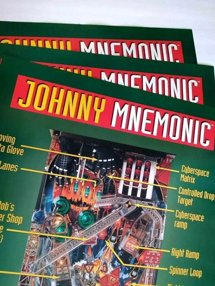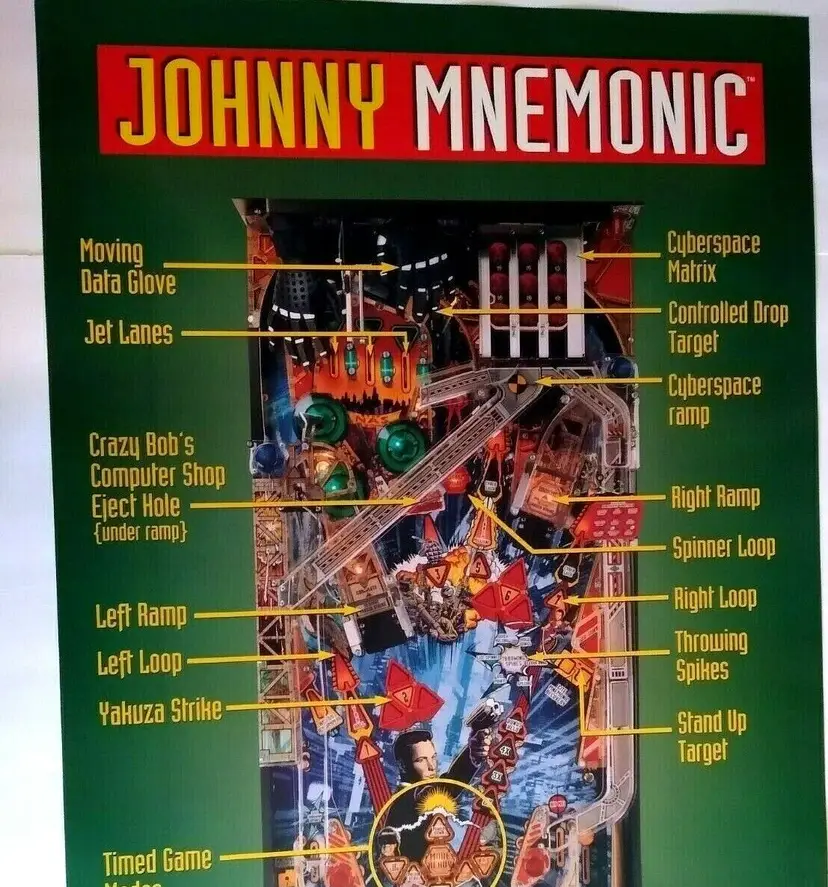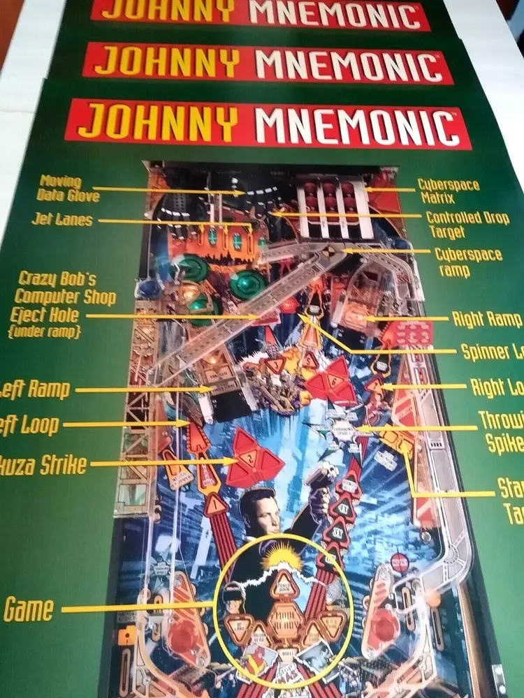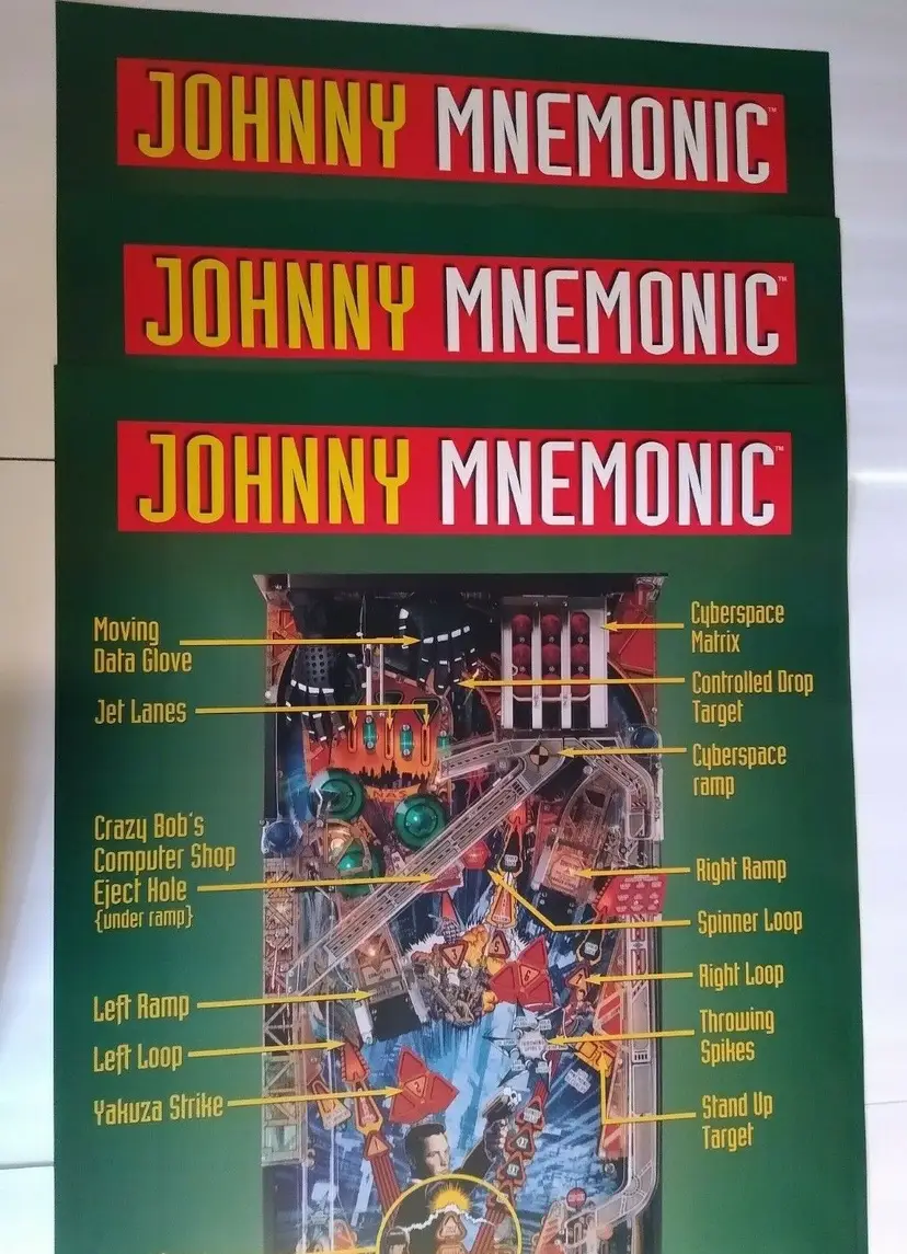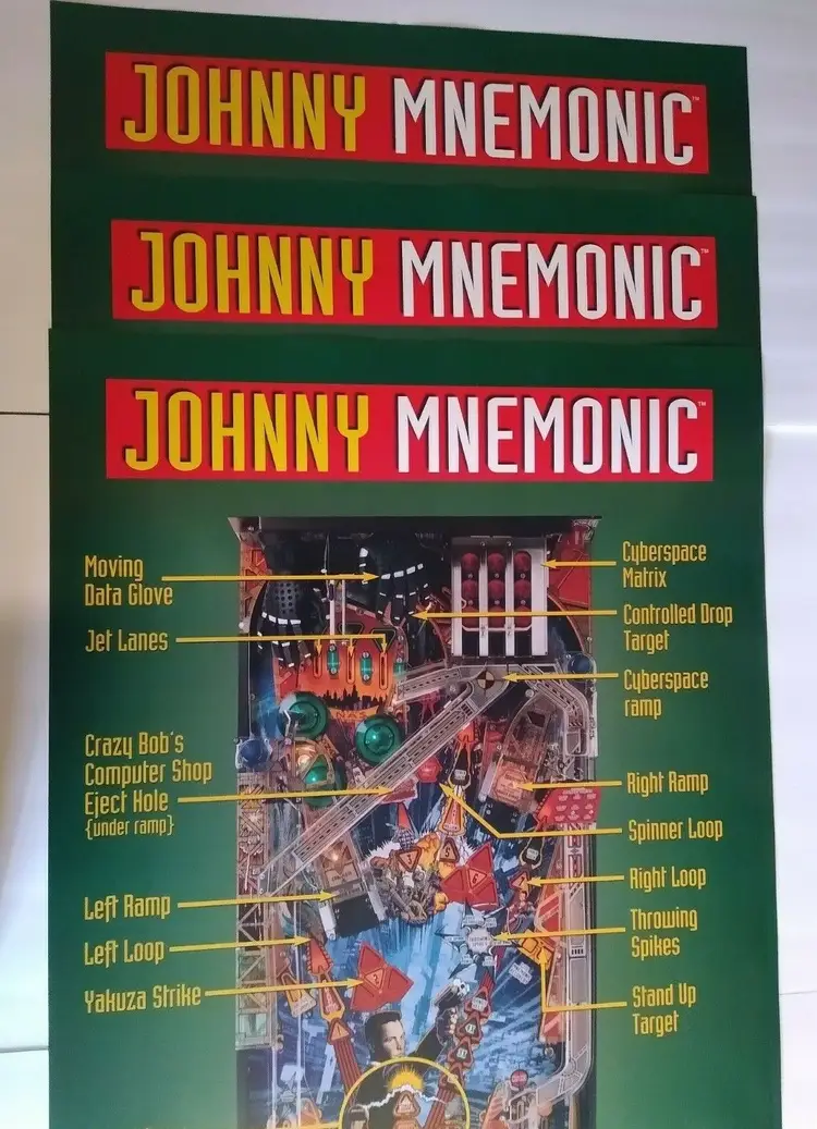 Lot of (10) all the same original 1995 promotional large wall posters (not a flyer) for the Williams Johnny Mnemonic pinball. Size is 36.25" X 24.25". Perfect for framing. Makes great wall art for the man cave or a unique gift idea. Minor wrinkles and storage wear only.