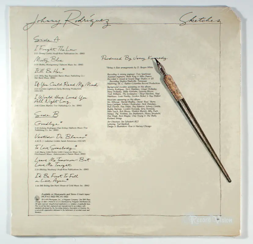 Sketches, by Johnny Rodriguez, stands out as a unique collection of cover songs drawn from rock, pop, and R&B influences, showcasing the singer's versatile baritone through atmospheric interpretations produced by Jerry Kennedy. What makes the album historically significant is Rodriguez's bold pivot to Epic Records, where he embraced eclectic material to evolve his sound amid the waning outlaw country era, further cementing his role as a trailblazing Mexican-American artist who bridged genres and audiences. Interesting facts include its sparse, introspective arrangements that transform familiar tunes into moody vignettes, with the bilingual track Vestido De Blanco highlighting his cultural roots alongside English standards. Fan-favorites among collectors and longtime admirers often include his haunting rendition of If You Could Read My Mind by Gordon Lightfoot, the soulful Misty Blue originally by Wilma Burgess, and the rebellious I Fought The Law popularized by The Bobby Fuller Four. This album remains a cult gem for those valuing Rodriguez's artistic risks over commercial formulas, reflecting his enduring commitment to honest, boundary-pushing country expression.