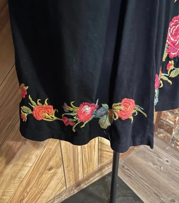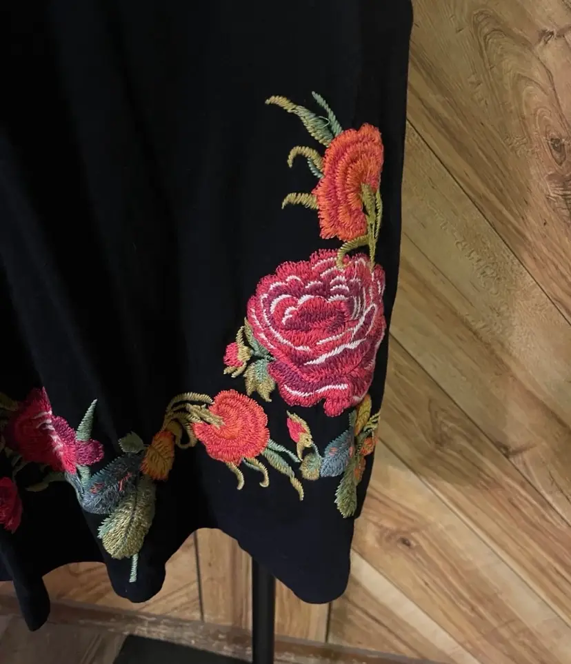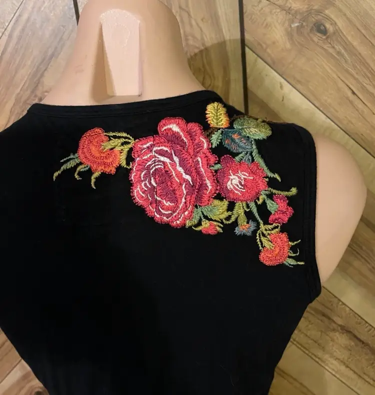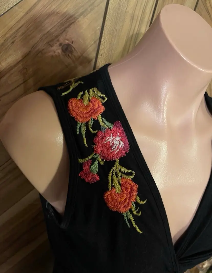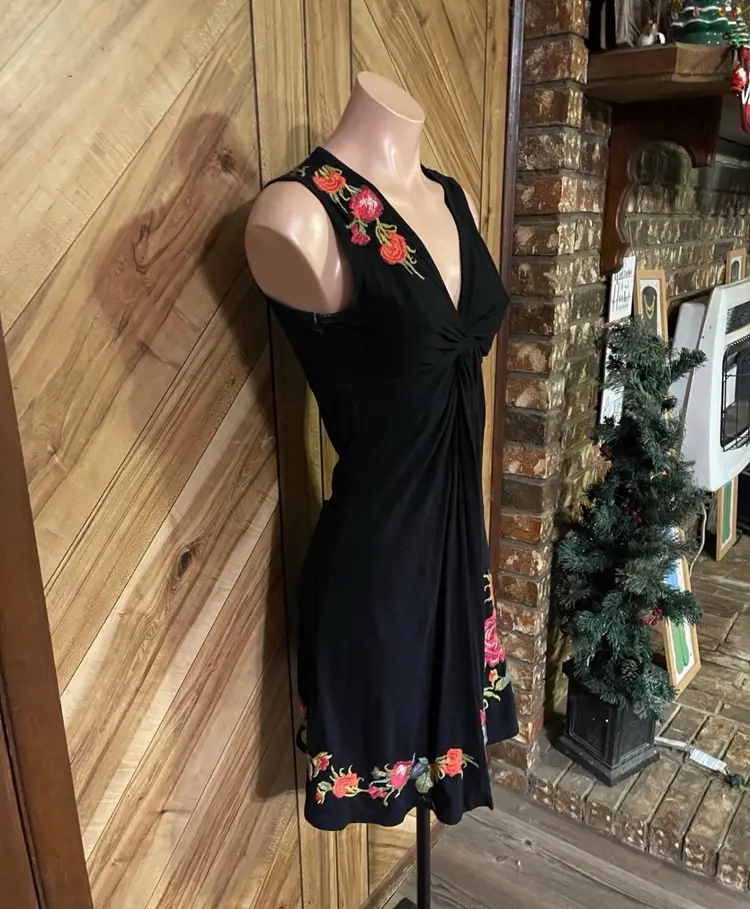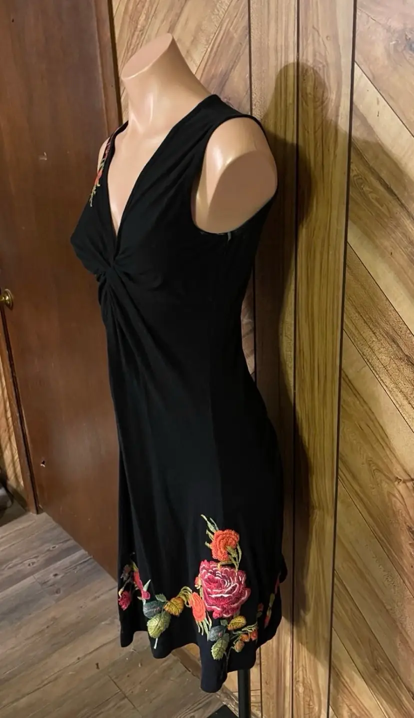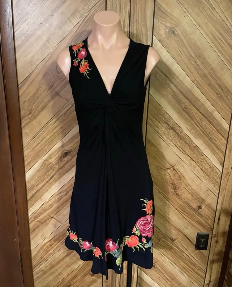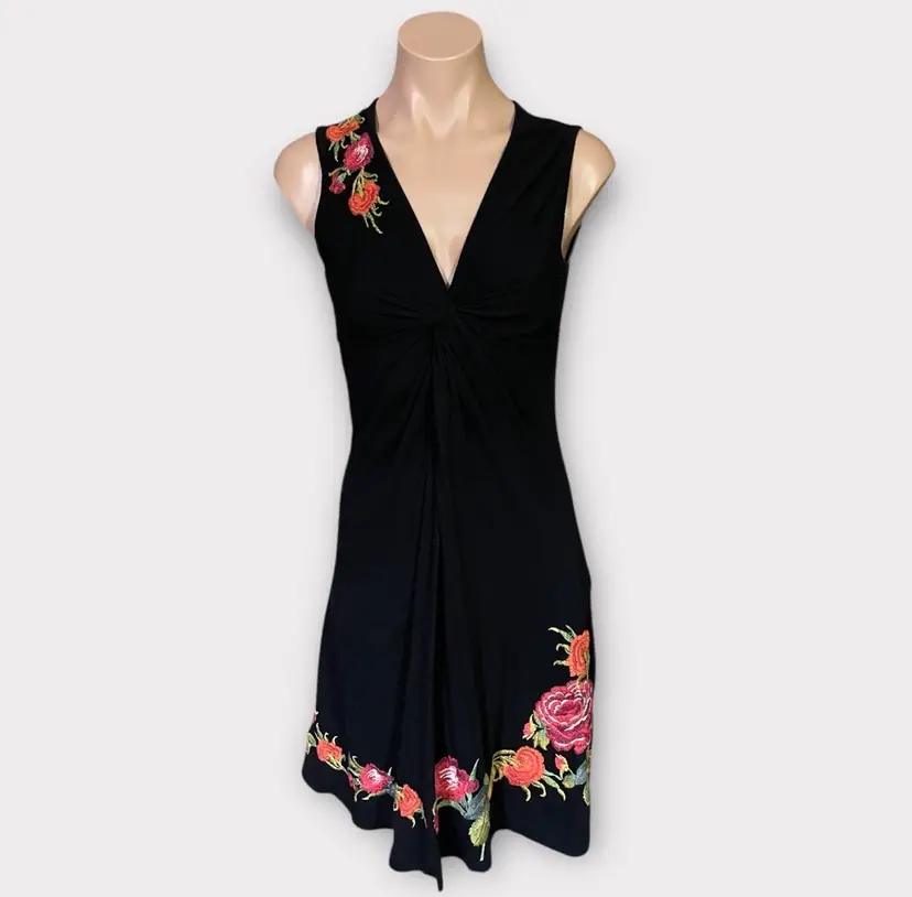 This dress is a stunning example of the brand's signature boho-chic aesthetic. Crafted from a high-quality black knit, this sleeveless piece features intricate, vibrant floral embroidery that cascades down the right shoulder and adorns the hem. The flattering V-neckline is accented by gathered/twist detailing at the bust, creating a sophisticated empire waist silhouette that drapes into a comfortable knee-length fit. • Condition: Very Good Used Condition (VGUC) • Size: Small • Color: Black with Multi-Color Floral Embroidery • Features: V-Neck, Sleeveless, Intricate Embroidery, Twist Bust Detail