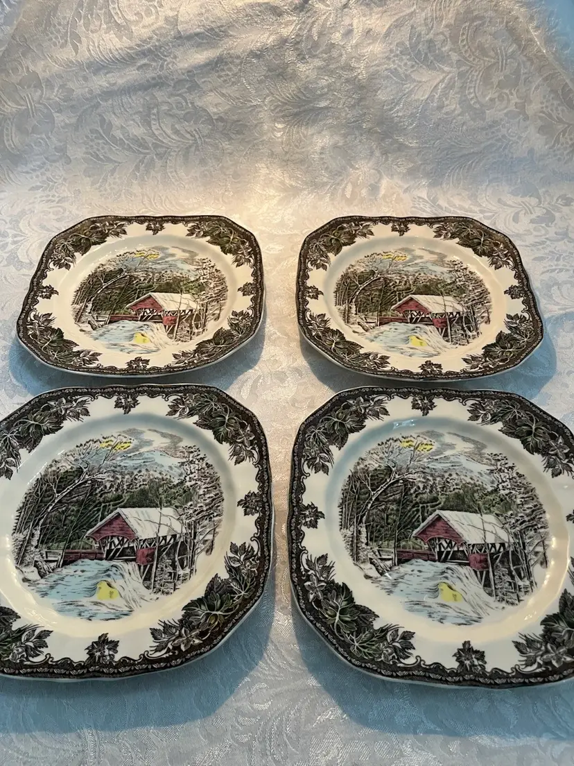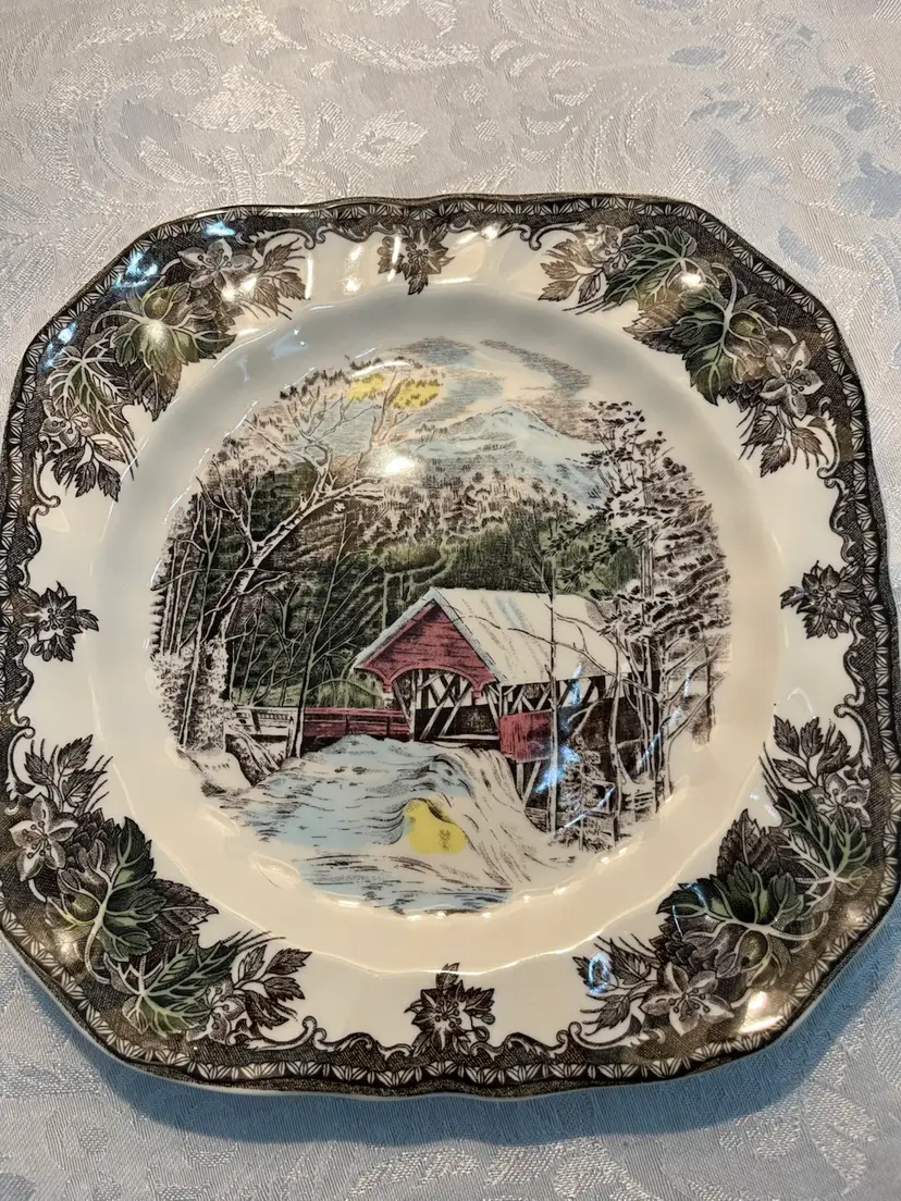The series was particularly popular in the mid-20th century and is known for its transferware technique, which gives the images a detailed, slightly vintage look. The covered bridge scene is one of the most iconic and sought-after designs in the "Friendly Village" collection. Johnson Brothers' dinnerware is celebrated for its durability and classic appeal, making it a favorite among collectors and everyday users alike.