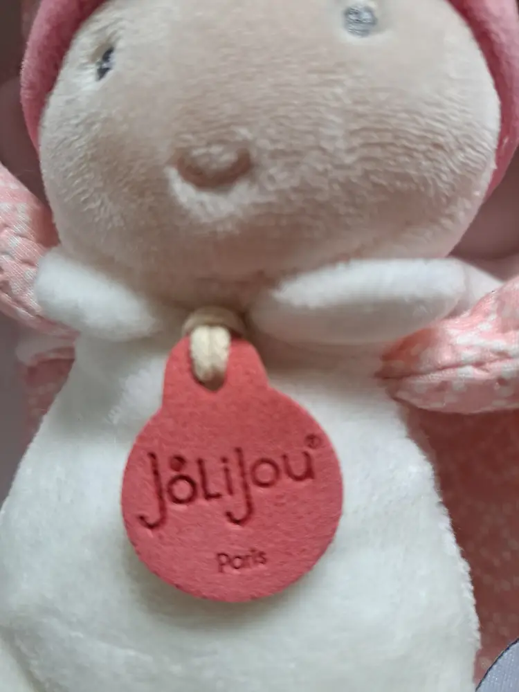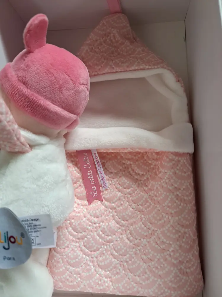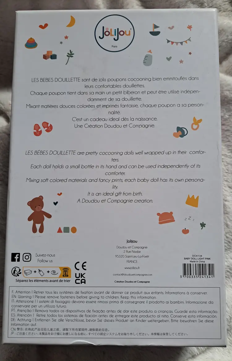 Up for sale we have this new in box Jolijou baby doll light pink with bottle in hand and a swaddling blanket and hat. this is an estate sale find and in excellent condition. This doll is adorable, made from plush fabric and measures about 10 inches. Indeed a lovely addition to your baby doll collection. Thank you for looking.