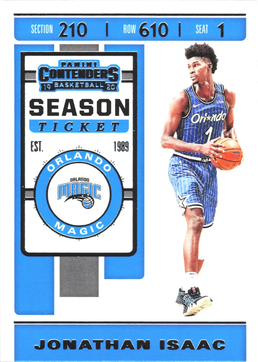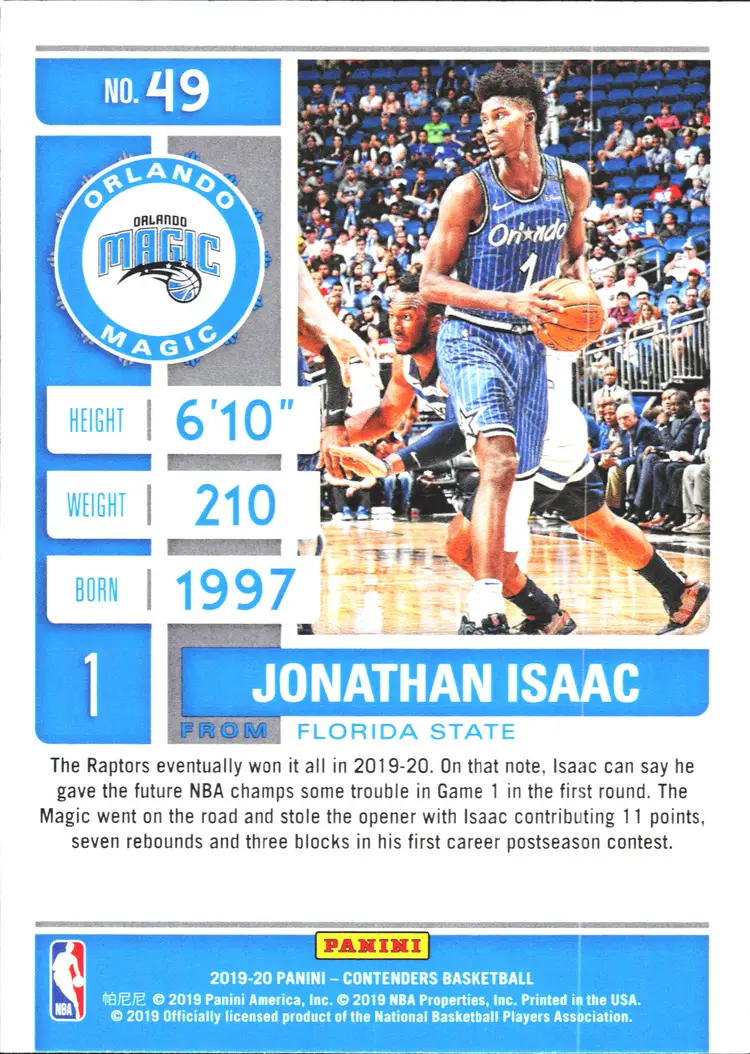 1st time buyer? Get $5 Off with code DISTRICT5 at checkout! Card as shown. All cards $20 and under ship PWE via lettertrackpro [https://www.letter-track.com/registerap.asp?AFID=8757] Sport: Basketball Set: 2019 Panini Contenders Card Name: Jonathan Isaac - Orlando Magic Card Number: 49 Player/Athlete: Jonathan Isaac Team: Orlando Magic