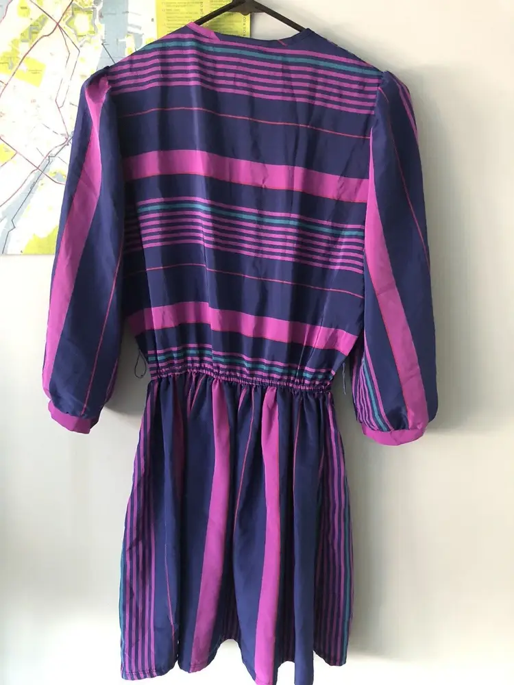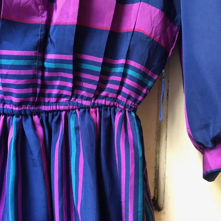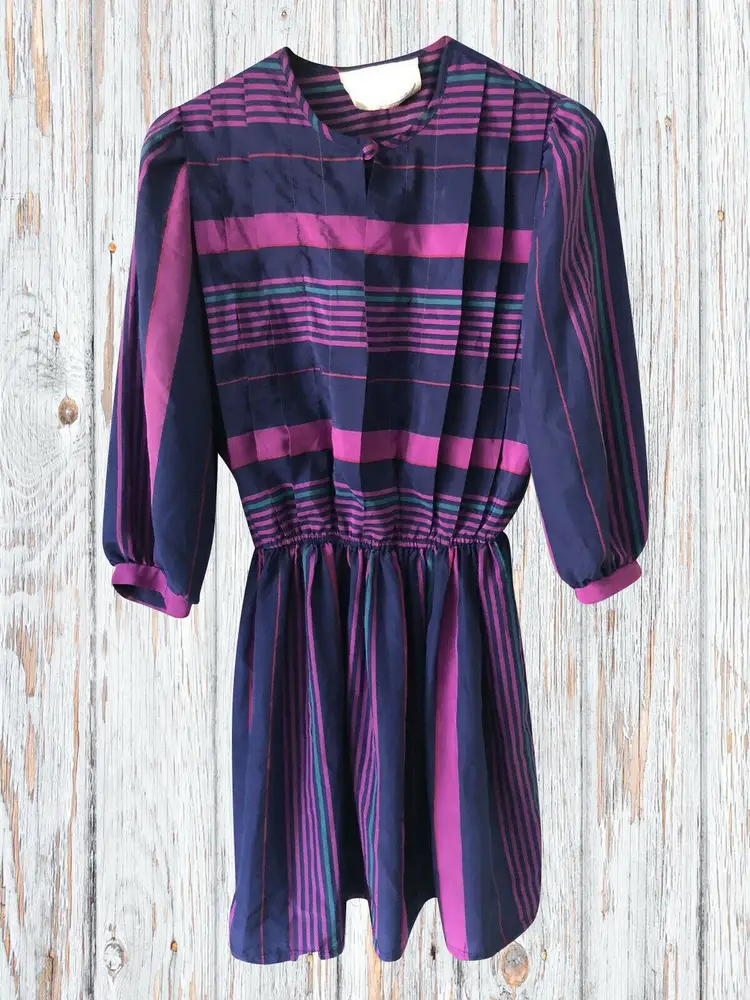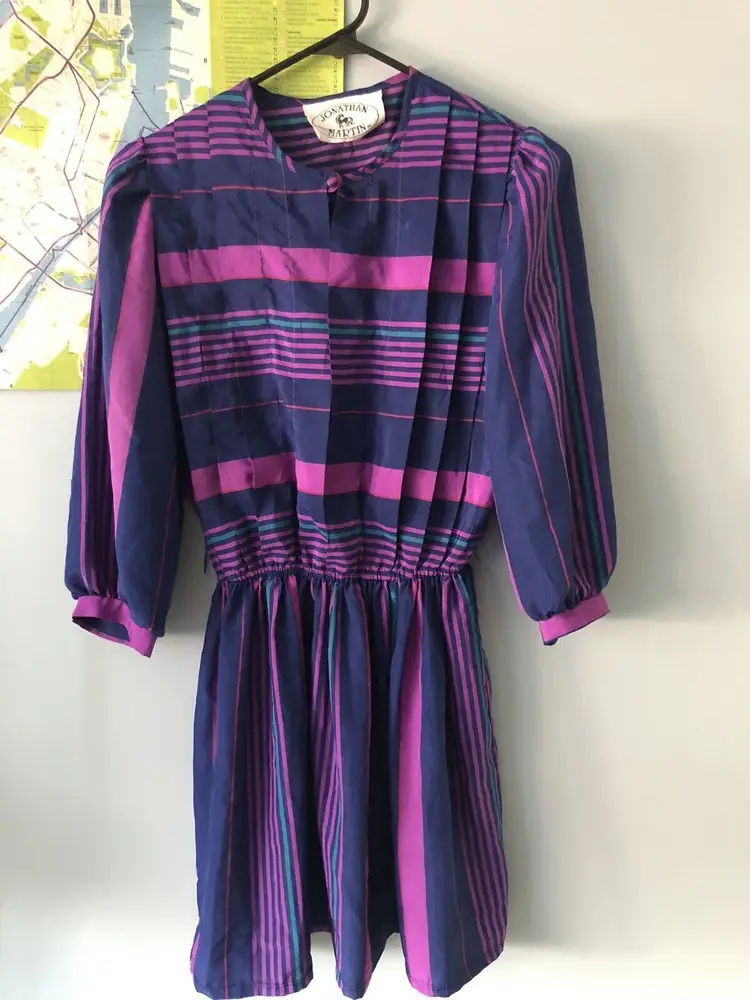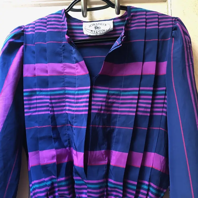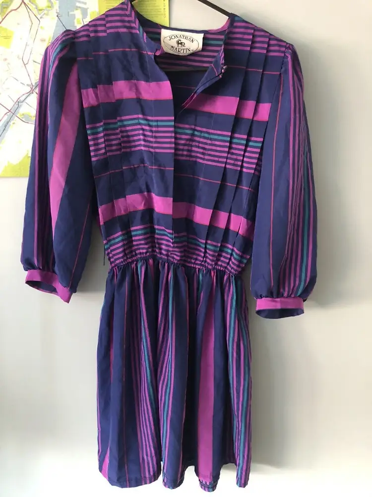 Size: 6 Character: Blue, Magenta Accents: Pleated Dress Length: Knee Length Department: Women Style: A-Line Fabric Type: Satin Material: Nylon blend Theme: 80s, Colorful Pattern: Striped Color: Blue Vintage: Yes Neckline: Round Neck Closure: Pullover Sleeve Length: 3/4 Sleeve Occasion: Casual Brand: Jonathan Martin Size Type: Regular
