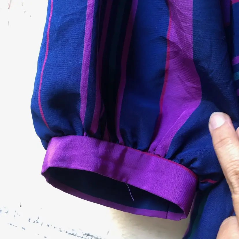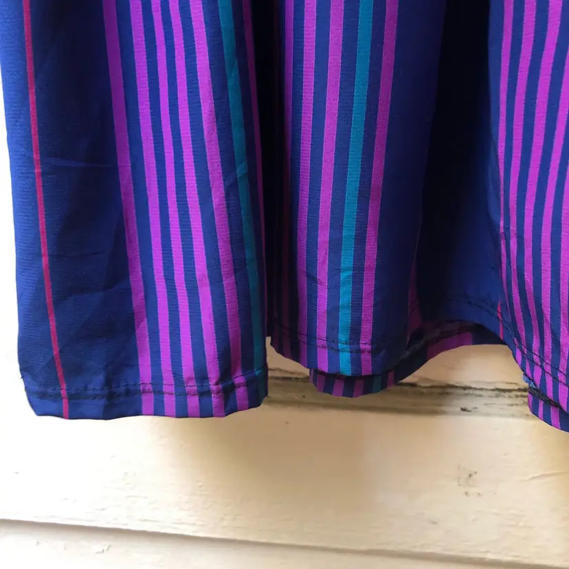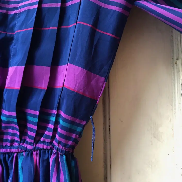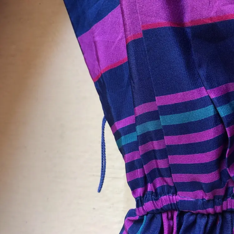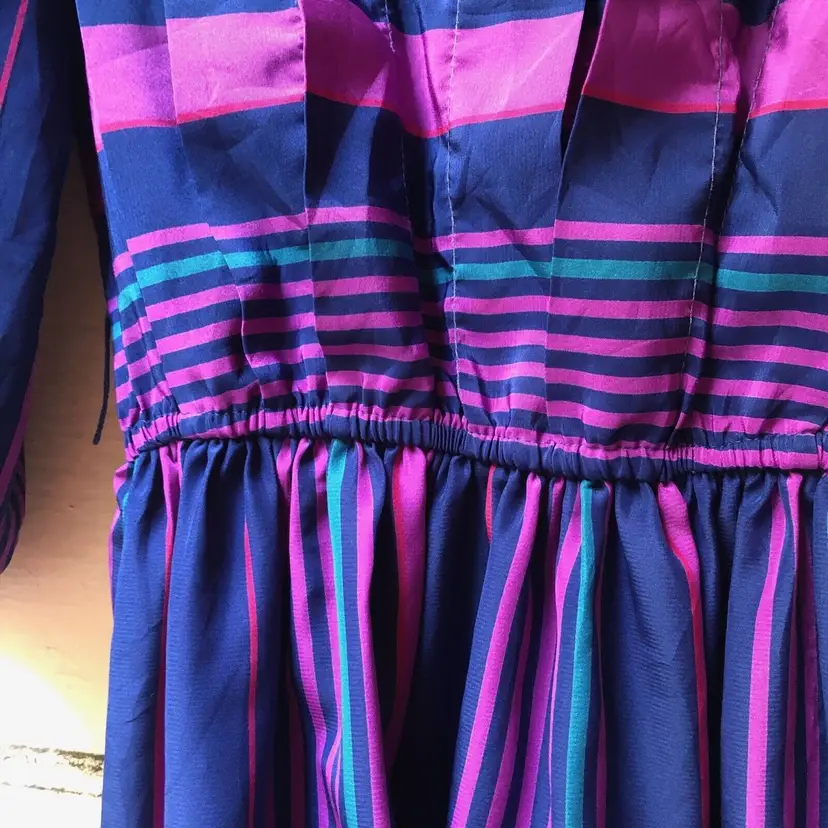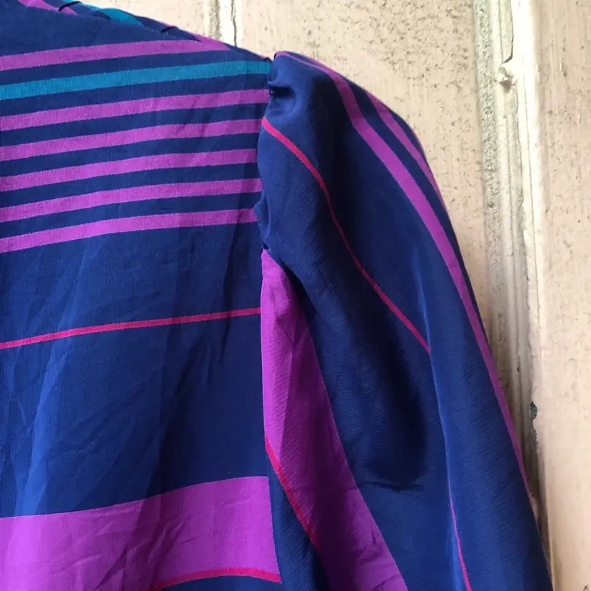 Size: 6 Character: Blue, Magenta Accents: Pleated Dress Length: Knee Length Department: Women Style: A-Line Fabric Type: Satin Material: Nylon blend Theme: 80s, Colorful Pattern: Striped Color: Blue Vintage: Yes Neckline: Round Neck Closure: Pullover Sleeve Length: 3/4 Sleeve Occasion: Casual Brand: Jonathan Martin Size Type: Regular