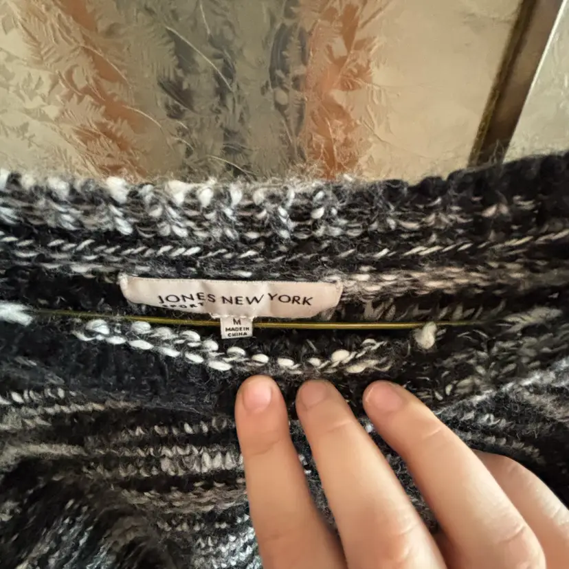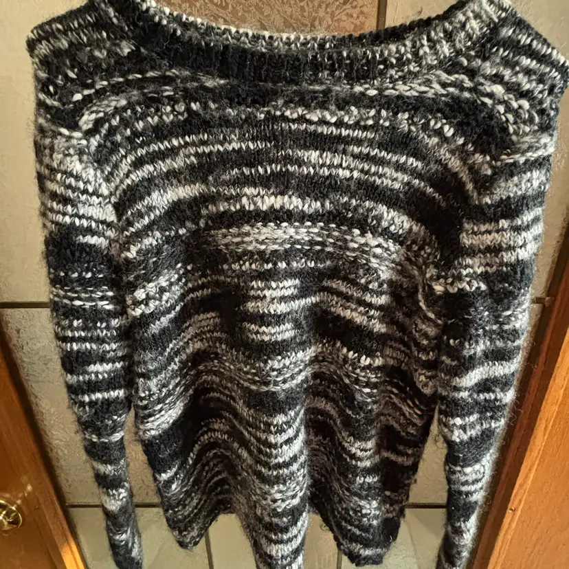 Soft knit women’s sweater in a black and white striped pattern. Comfortable crew neckline and long sleeves for everyday wear. Lightweight yet warm layering piece that pairs easily with jeans or skirts. Machine-washable knit for easy care. 18” - 21.5” pit to pit.