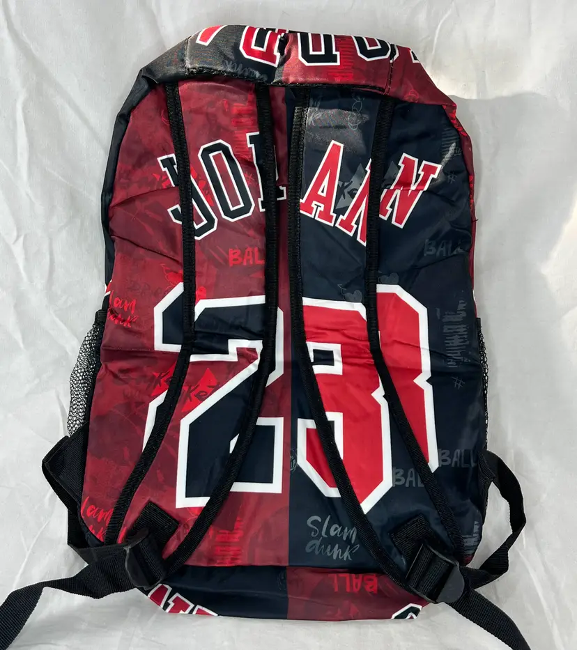 Stylish Jordan backpack featuring the iconic number 23 in bold red and black. Perfect for sports fans and everyday use, with a spacious main compartment and front zip pocket for easy access.