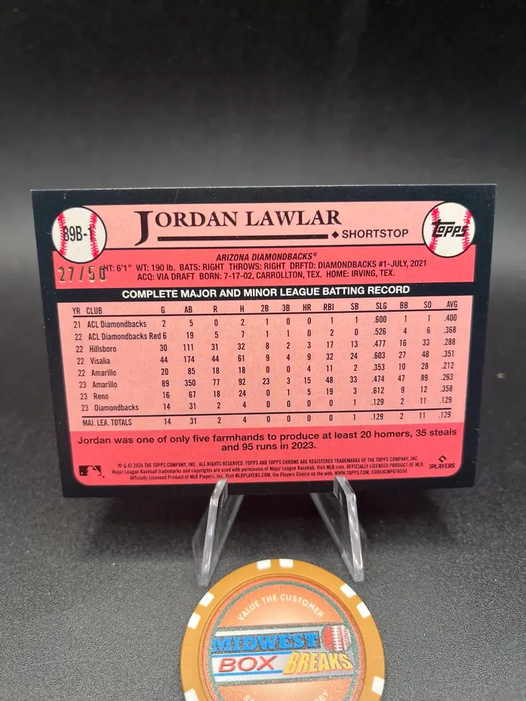 1989 foilboard of Jordan Lawlar #27/50 from Topps 2024 series 1. Arizona diamondbacks.