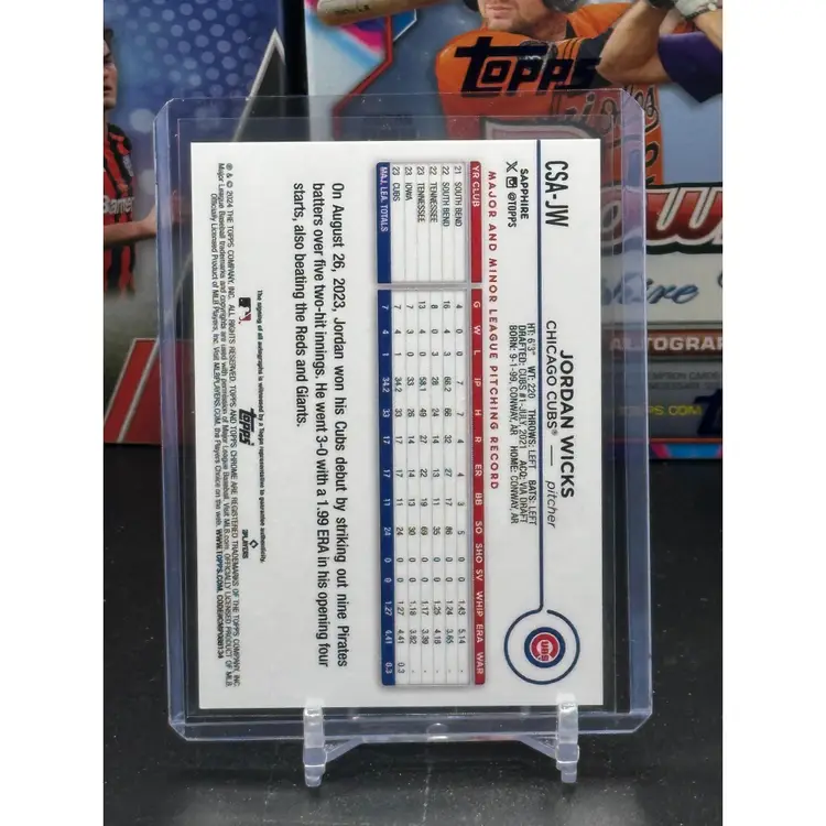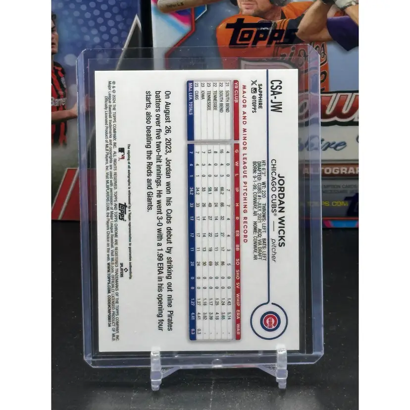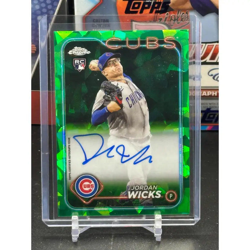 Chicago Cubs rookie card featuring an on-card autograph of pitcher Jordan Wicks. A must-have for any Cubs fan or card collector.