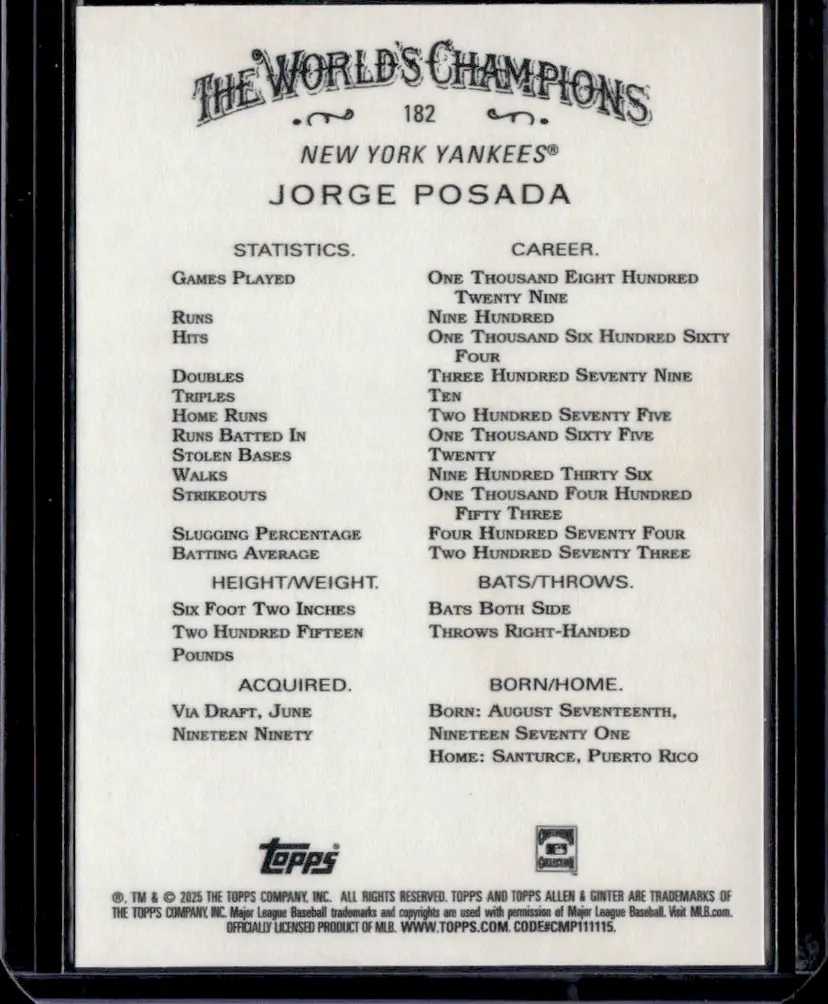 Grab this Jorge Posada card from the 2025 Topps Allen & Ginter series. A great pick for Yankees fans and card collectors.