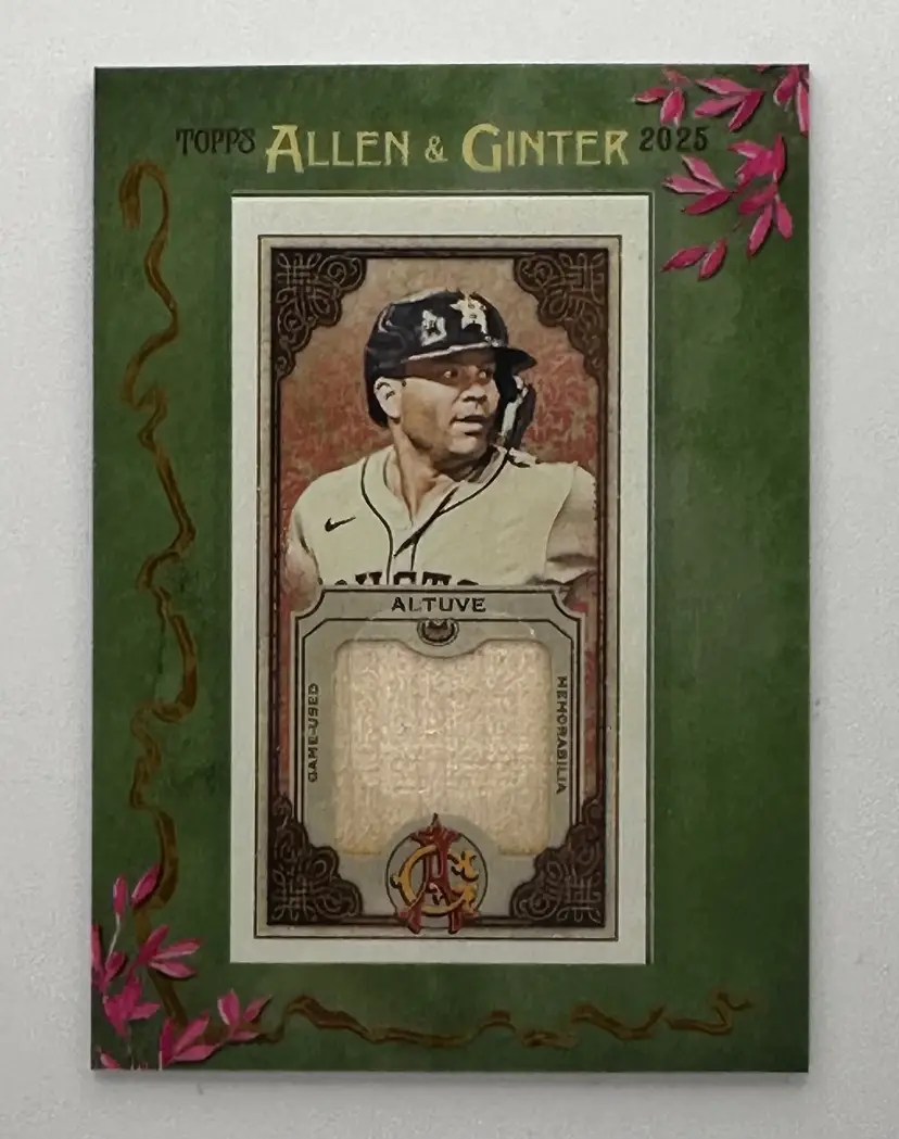 Grab this unique Jose Altuve card from the 2025 Topps Allen & Ginter series, featuring a piece of game-used memorabilia. A great addition for any Astros fan!