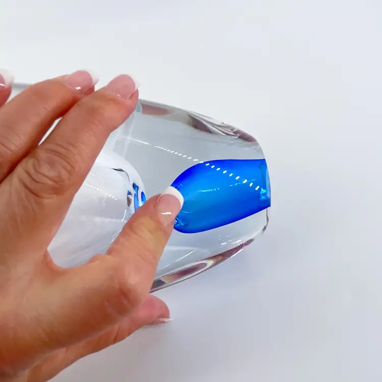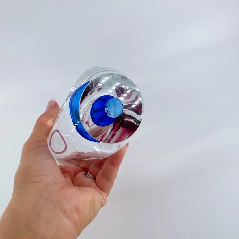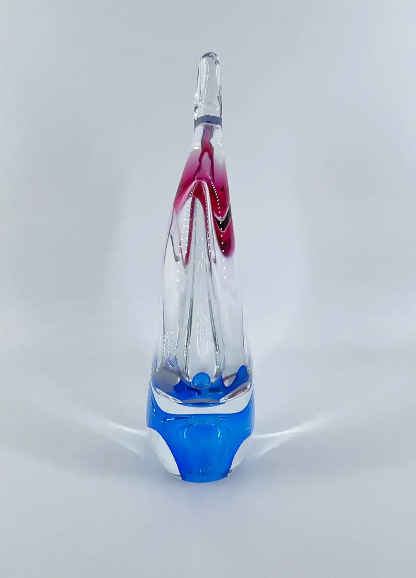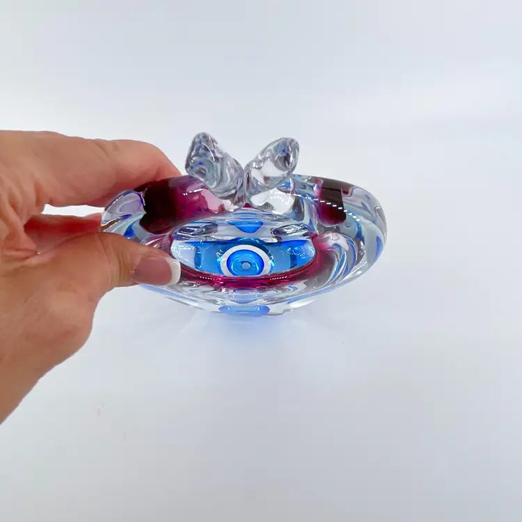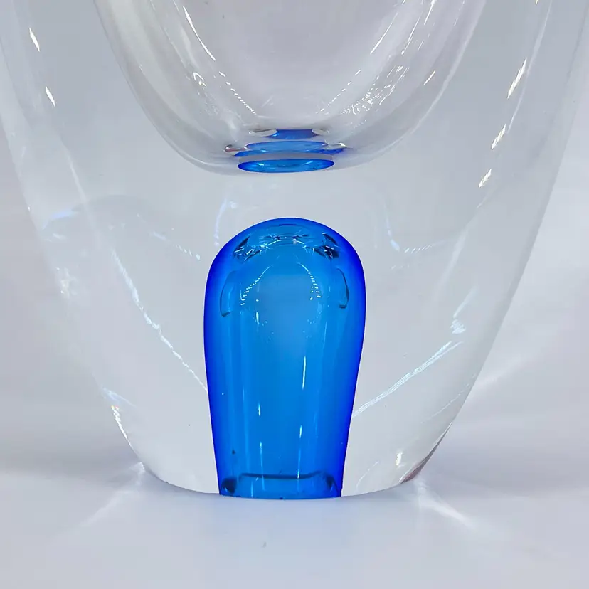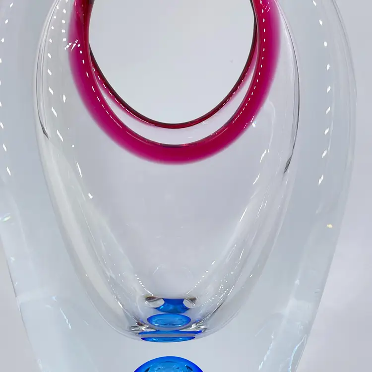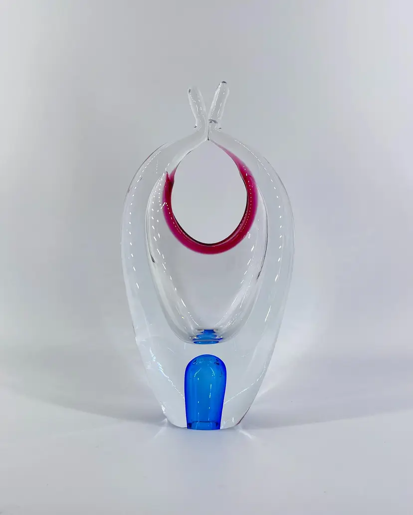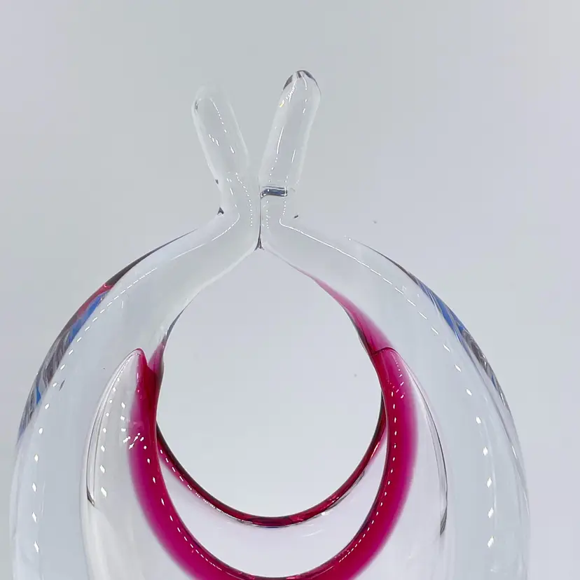 Based on research, this stunning glass vase/basket was made by Josef Hospodka for Chribska in Czech Republic. It is 9.5" tall and measures 5"x3". It is in excellent condition. There are no cracks, breaks, chips or repairs. There is a small rub mark on one side. (See photos).