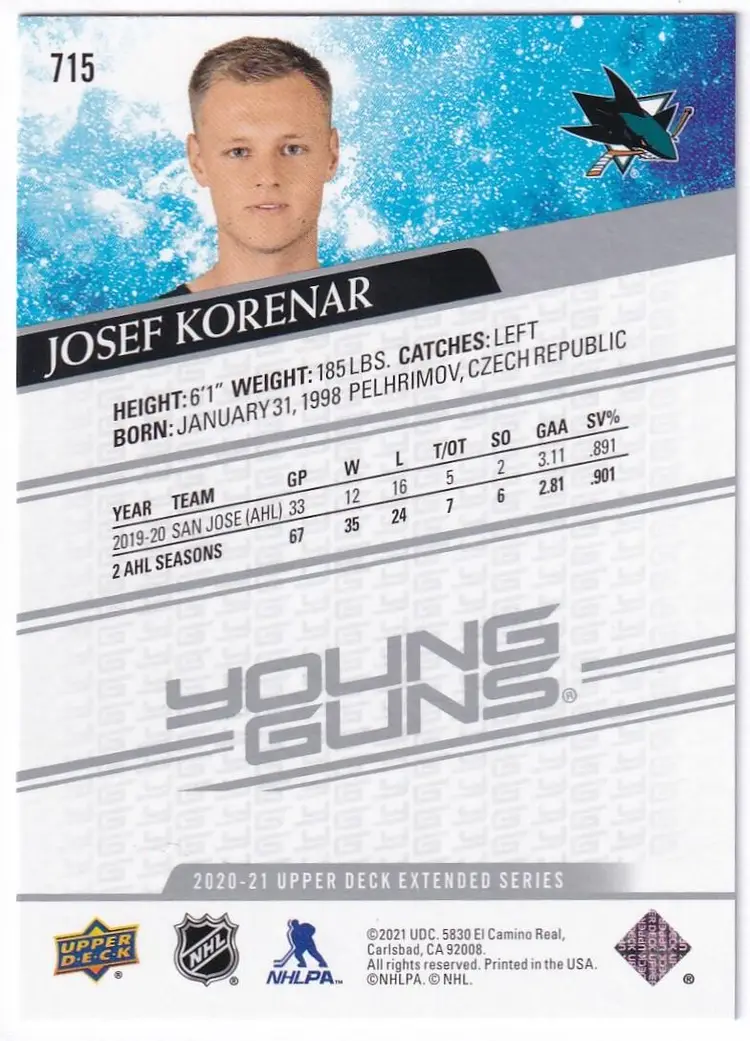 2020-21 Upper Deck #715 Josef Korenar YG RC San Jose Sharks Young Guns
