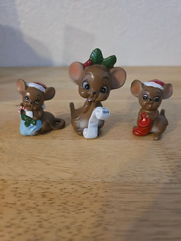 This set of three mice are perfect. They all have made in Japan stickers. No chips or cracks. They are about 2 and 3 inches tall.