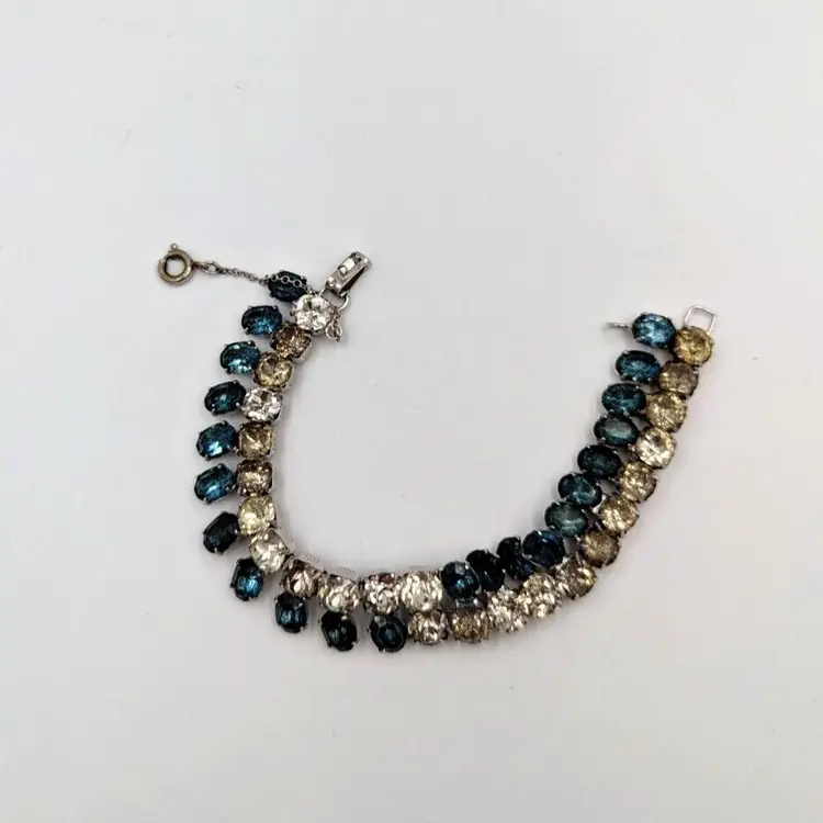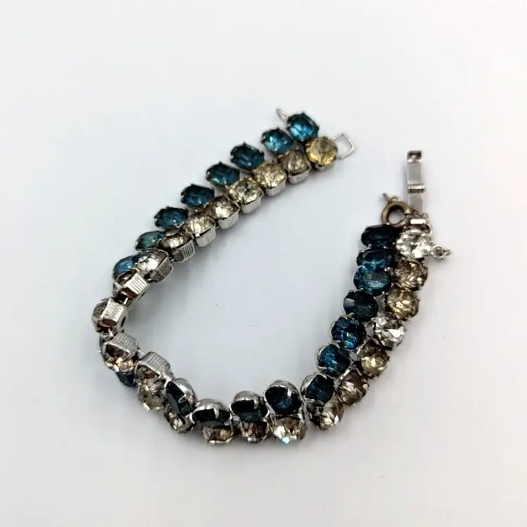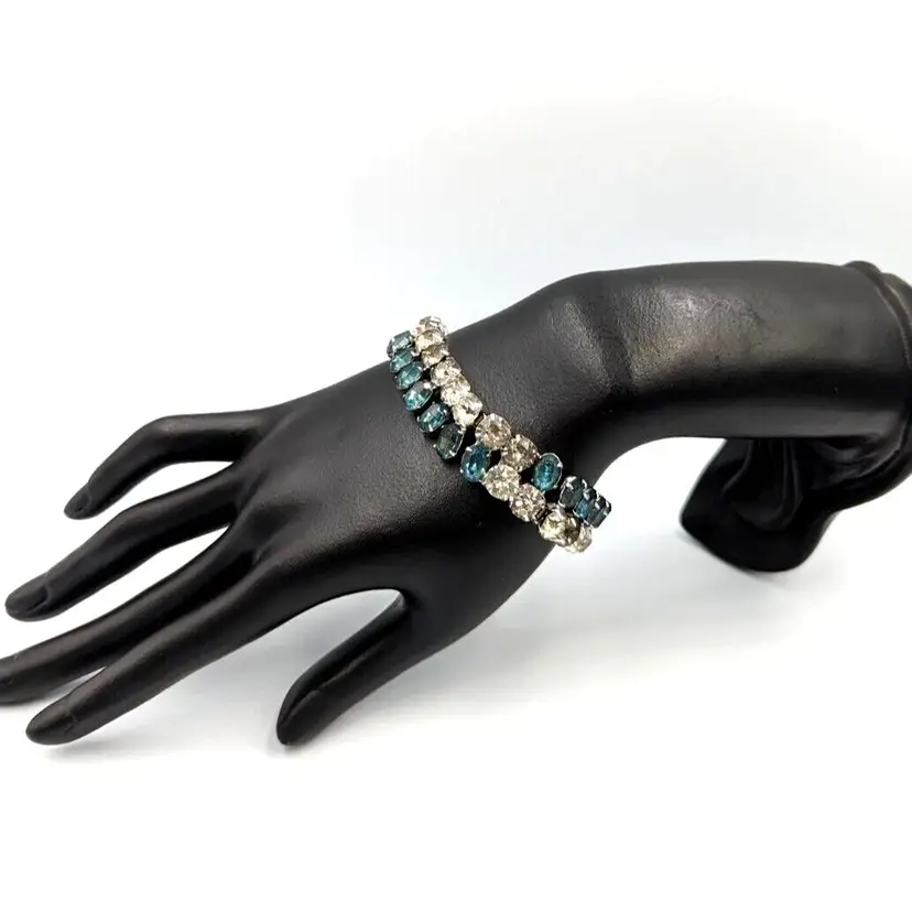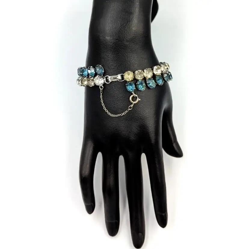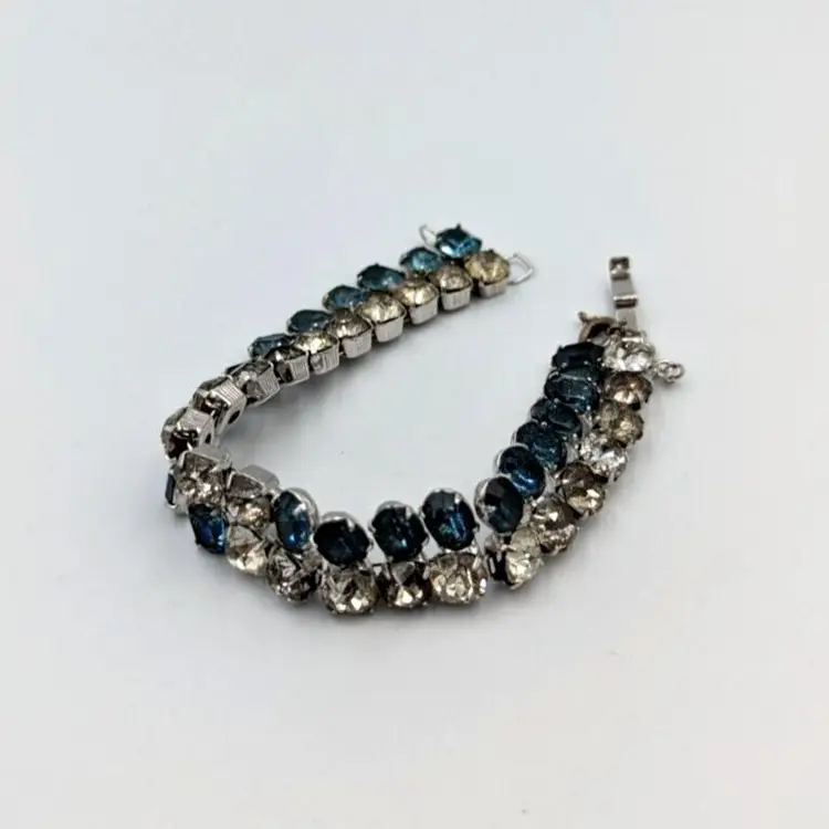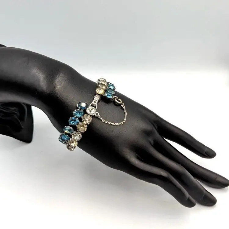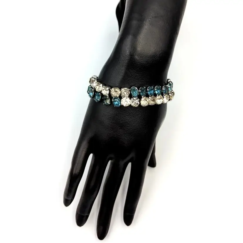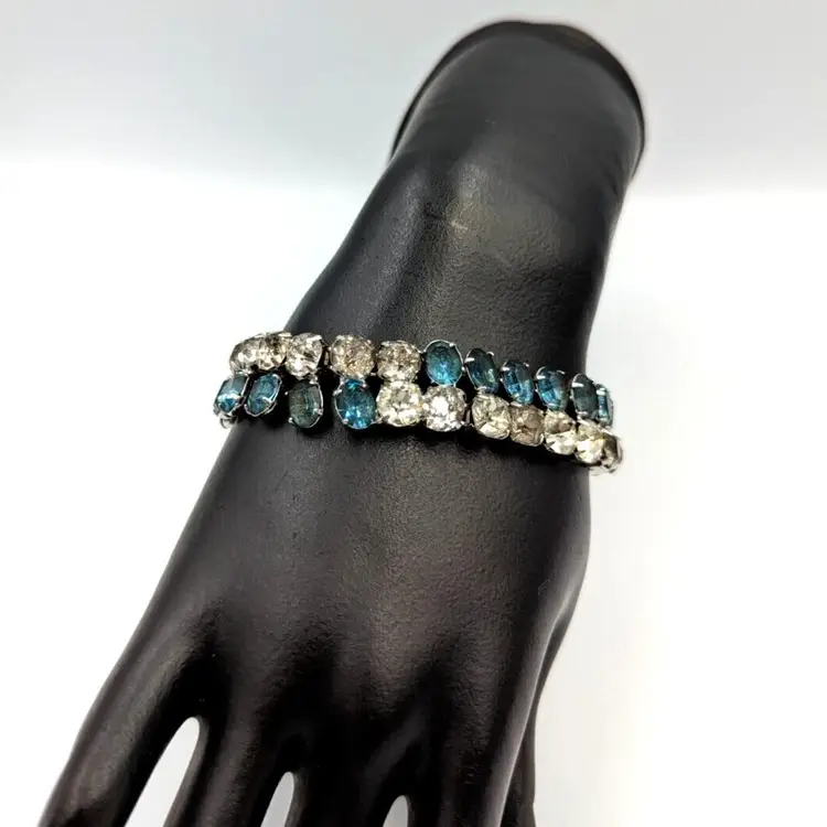 Joseph Wiesner NY Bracelet Vintage Clear And Blue Rhinestones Silver Tone 7" Signed Joseph Wiesner N.Y. Fold over Clasp, safety chain Good Vintage Condition
