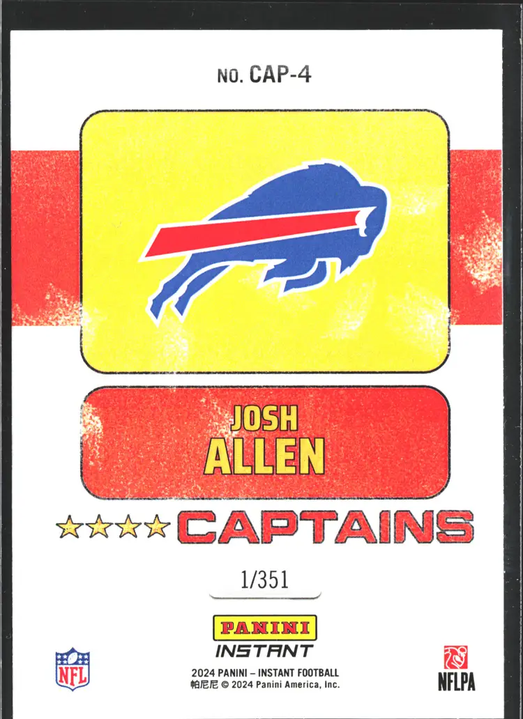 1st time buyer? Get $5 Off with code DISTRICT5 at checkout! Card as shown. All cards $20 and under ship PWE via lettertrackpro [https://www.letter-track.com/registerap.asp?AFID=8757] Sport: Football Set: 2024 Panini Instant NFL Manufacturer: Panini Features: Limited Edition, Serial Numbered Season: 2024 Player/Athlete: Josh Allen Type: Sports Trading Card Autographed: No Year Manufactured: 2024 Vintage: No Graded: No Team: Buffalo Bills League: National Football League (NFL) Card Condition: Near Mint or Better Material: Card Stock Original/Licensed Reprint: Original Country/Region of Manufacture: United States