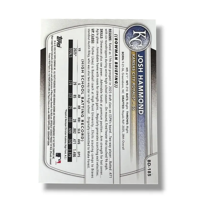 Here We Have a Josh Hammond 1st Bowman Kansas City Royals 2025 Bowman Draft Blue #'d 73/150