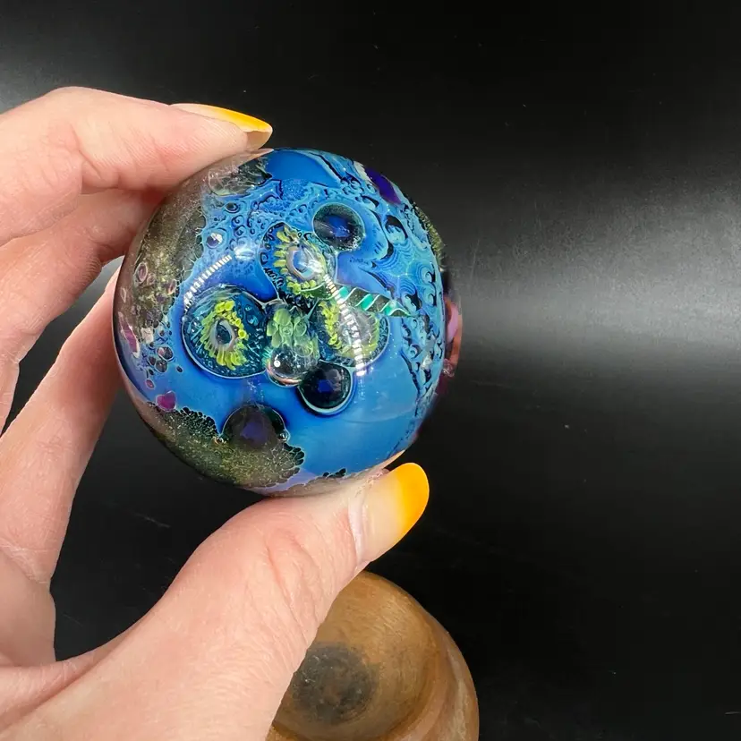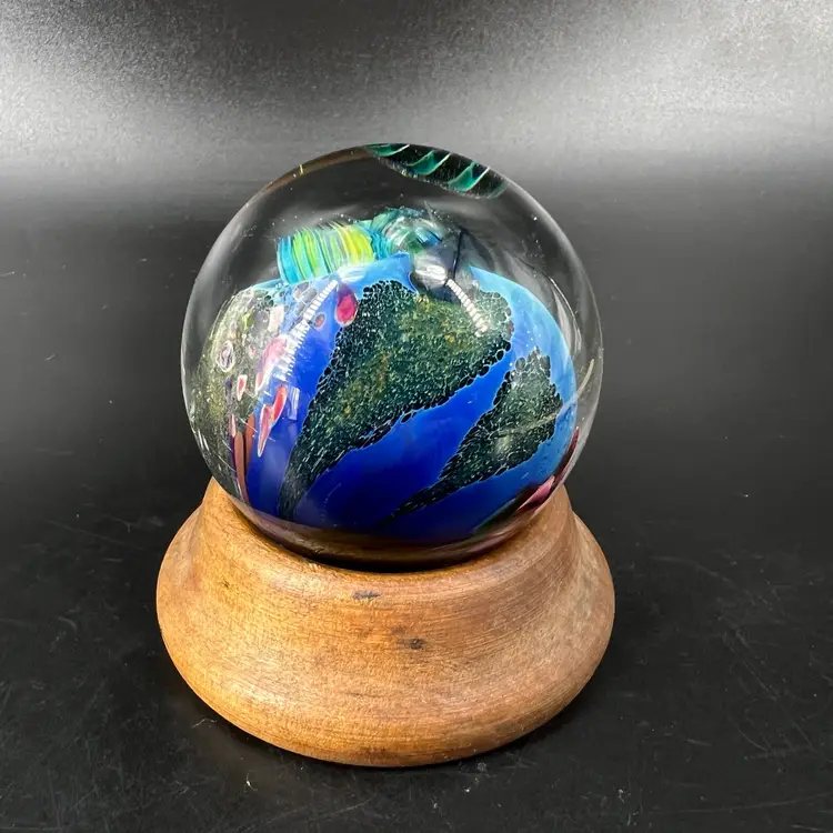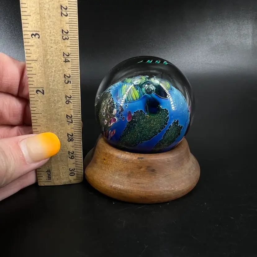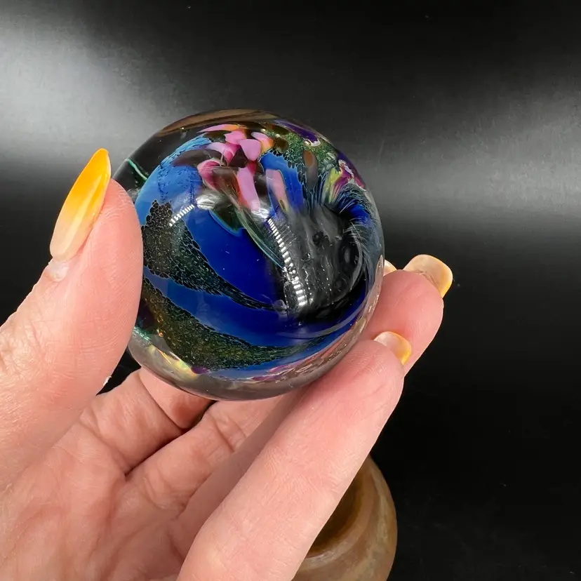 This art glass marble is attributed to Josh Simpson. It is unsigned, but has provenance. It measures approx 2”.