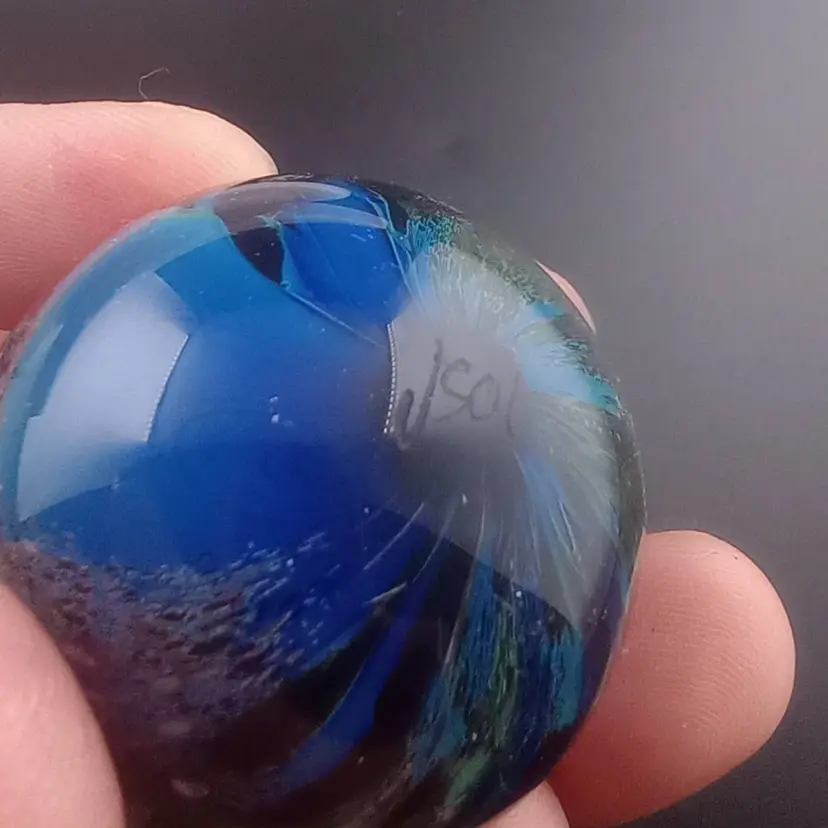 It's about 1.5" across and in excellent condition with no bruises or scratches. The base is flat with the signature JS01. (The white lines in the first picture are a reflection of the light fixture and not part of the paperweight.)