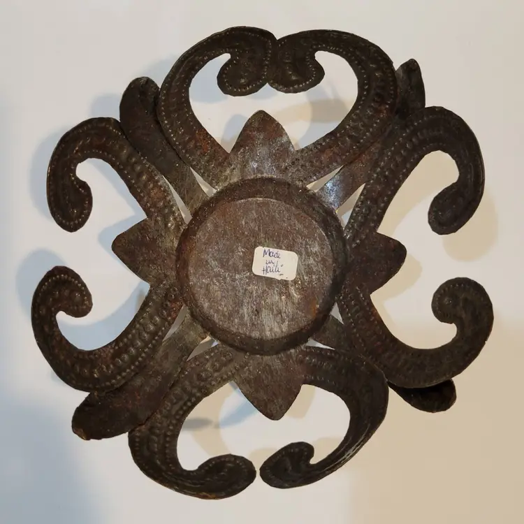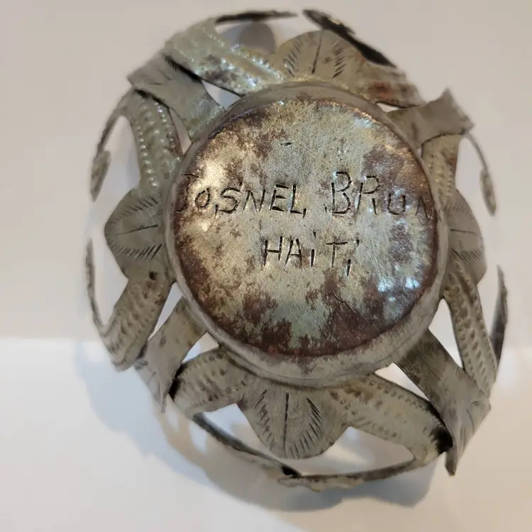 Artist: Josnel Bruno was an apprentice to master Serge Jolimeau and is now a metalworker in Croix-des-Bouquets, Haiti, who transforms discarded oil drums into remarkable artwork with his skill and creativity. He describes himself as a “difficult child” who only found purpose once he was taught metalworking. His hammered, chiseled, punched, and incised bowls and platters represent yet another innovation within the tradition that now defines Josnel’s community to the world. Each piece is a way for him to pay tribute to his rich culture and religious beliefs. He is proud to be teaching the art to young apprentices, continuing the tradition.