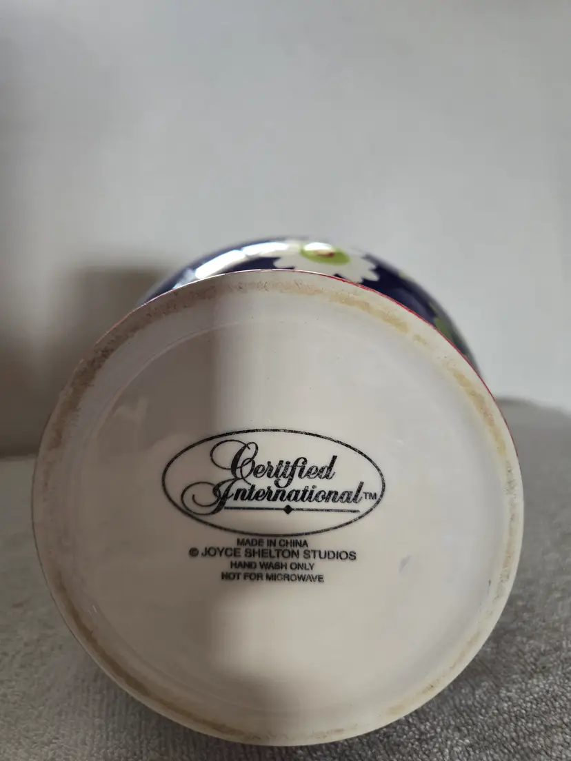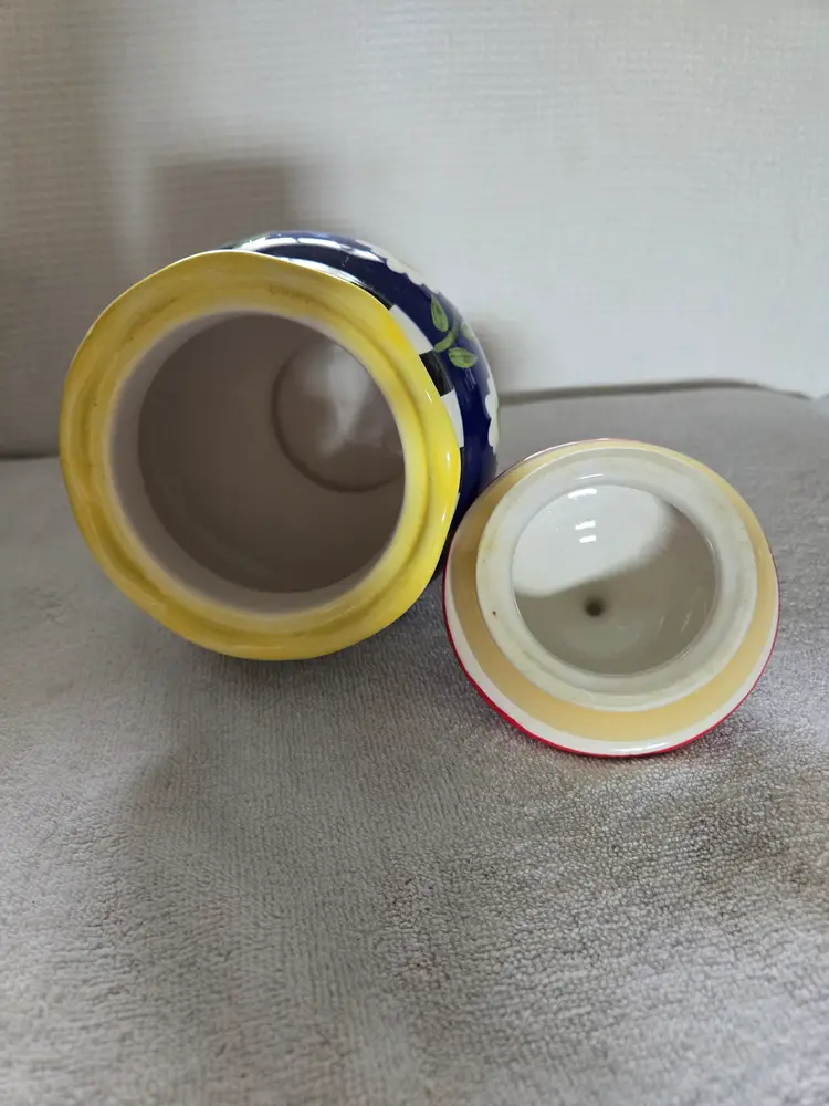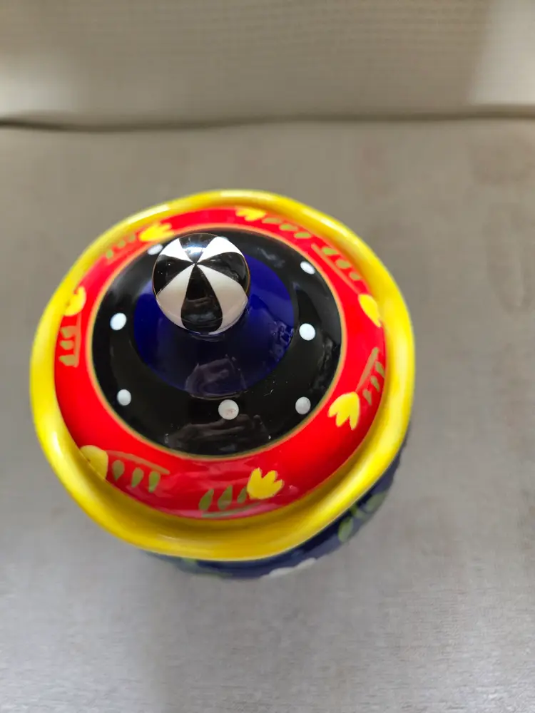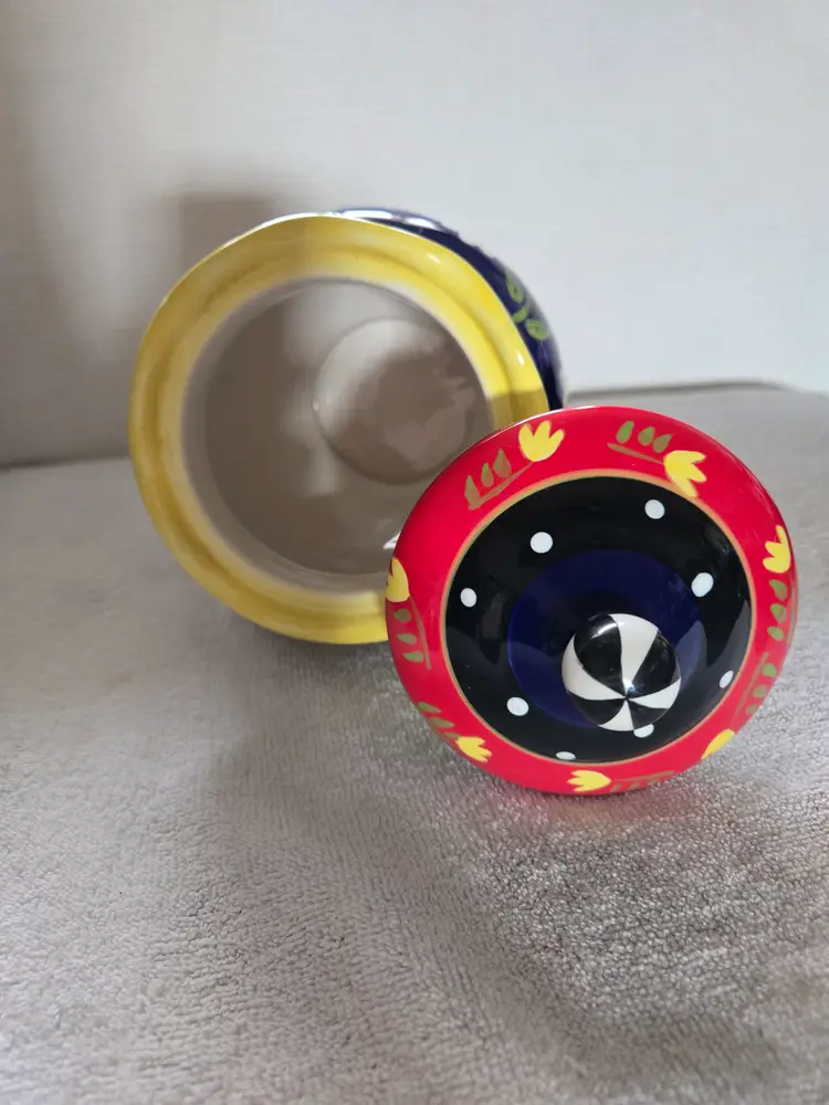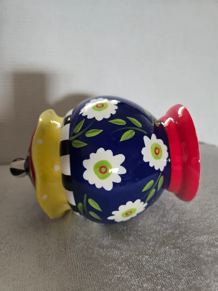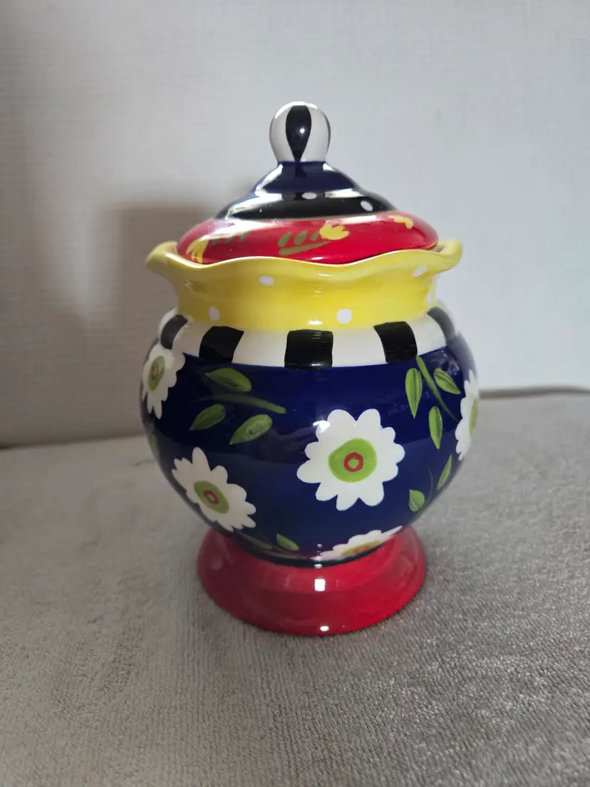 Inspired by Mary Englebreit collections. This is a lidded jar with vibrant colors of cobalt blue, yellow, black, and red, with white flowers and green leaves. 7 3/4" tall with lid, 5 1/4" without lid. 5 1/4" wide, lid is 3" tall. 4" around. In excellent condition. No chips, cracks, or repairs. Very pretty!