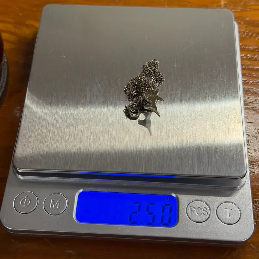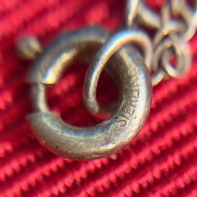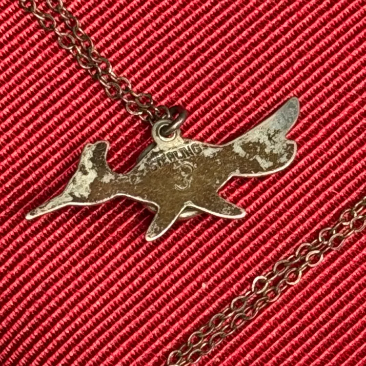 This striking necklace was created by Navajo silversmith Jerome Poyer. The age of this necklace is unknown, Poyer has had a long career and is still active in Texas. This pendant and necklace are both tested and marker sterling silver. The necklace chain is about 18 inches long.