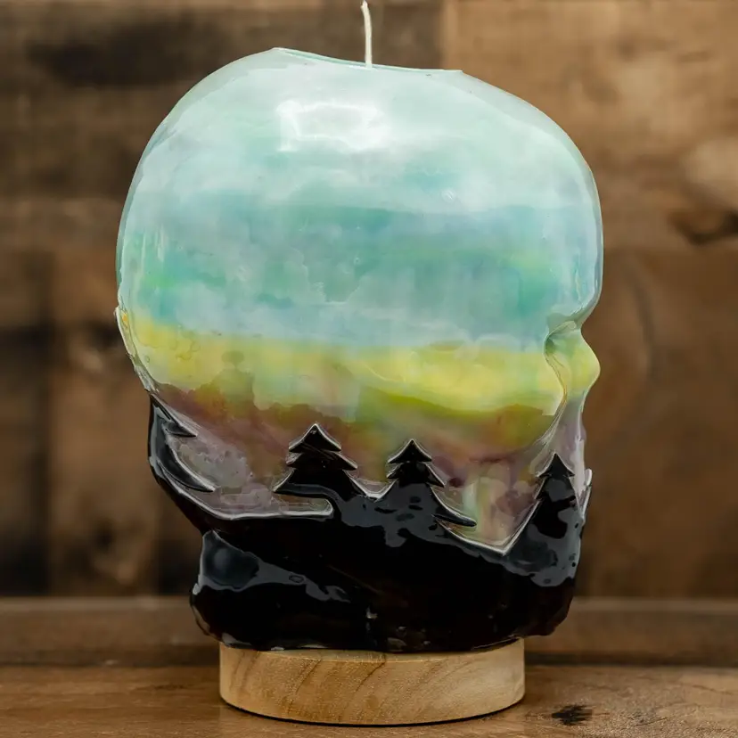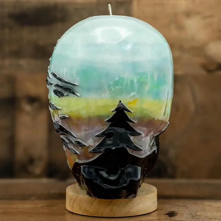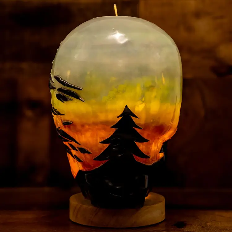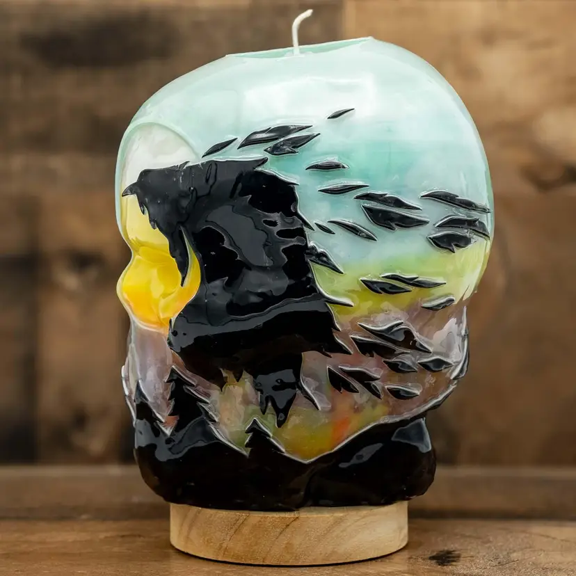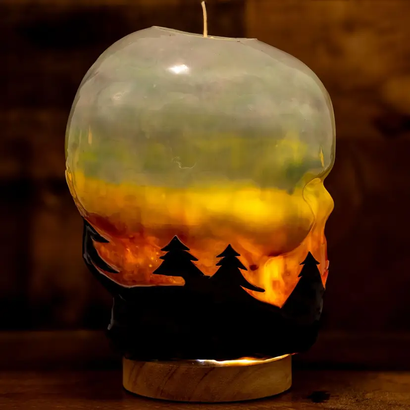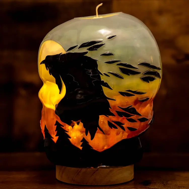 Dimensions: ~6”x5”x8” Weight: ~5lb. 100% food-grade paraffin wax. 100% cotton wick. Each candle is free-hand carved based on the original design (pictured in this listing) when ordered and no two candles are identical. Light base sold separately. The weight and size listed is approximate and may vary with each piece. Candles glow when burning or placed on a light base. High melt-point wax preserves exterior artwork after use and all candles are refillable with tealights.