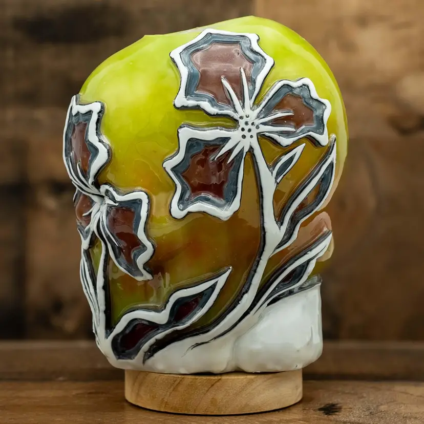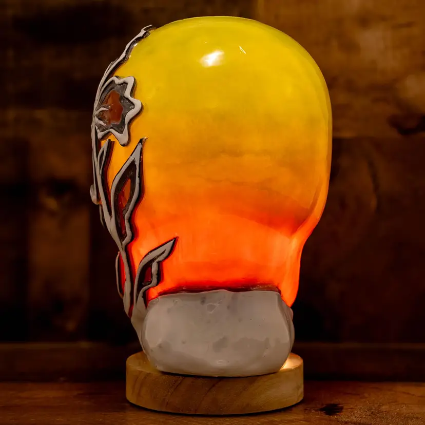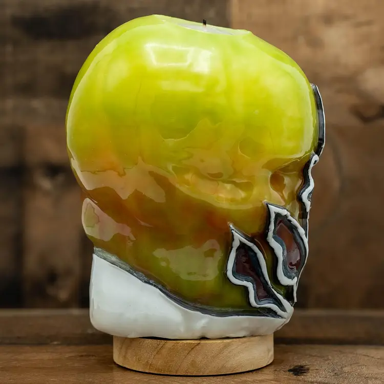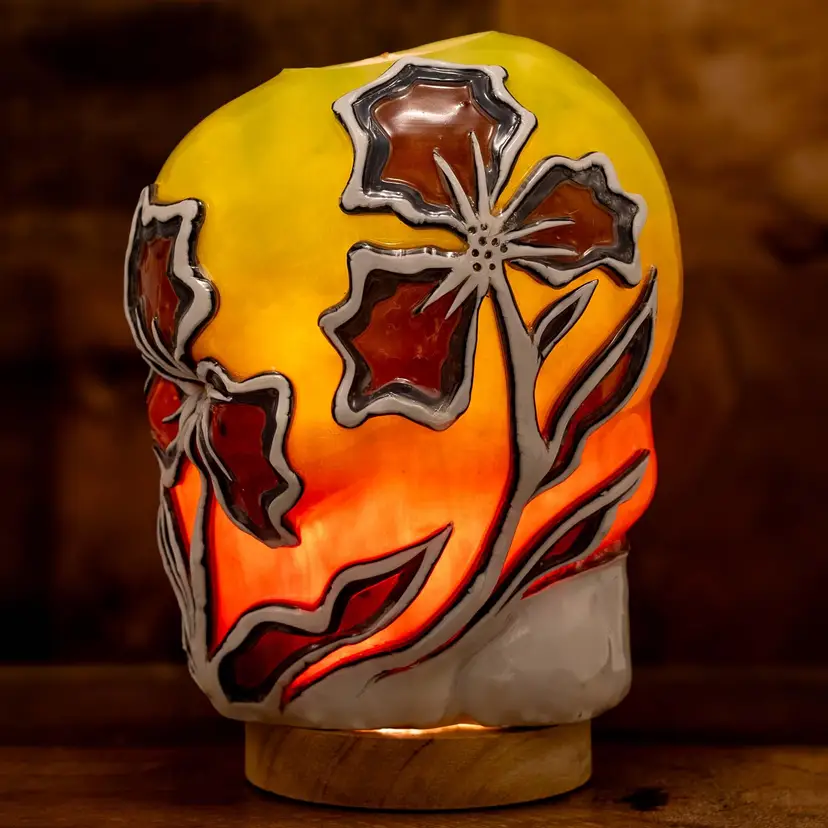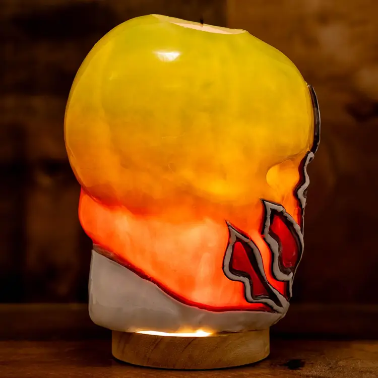 Dimensions: ~6”x5”x8” Weight: ~5lb. 100% food-grade paraffin wax. 100% cotton wick. Each candle is free-hand carved based on the original design (pictured in this listing) when ordered and no two candles are identical. Light base sold separately. The weight and size listed is approximate and may vary with each piece. Candles glow when burning or placed on a light base. High melt-point wax preserves exterior artwork after use and all candles are refillable with tealights.
