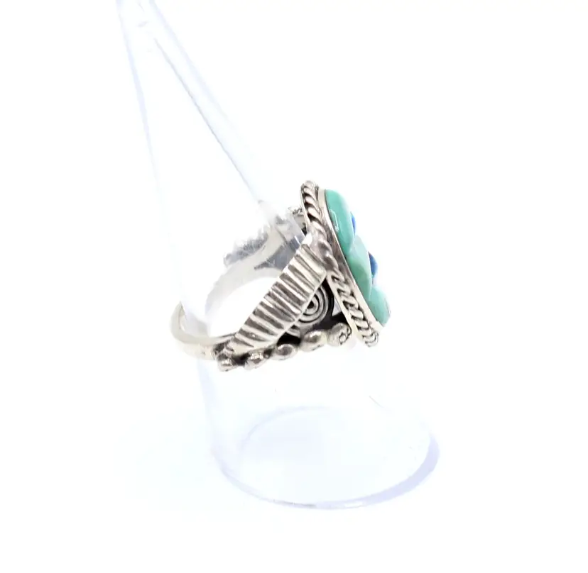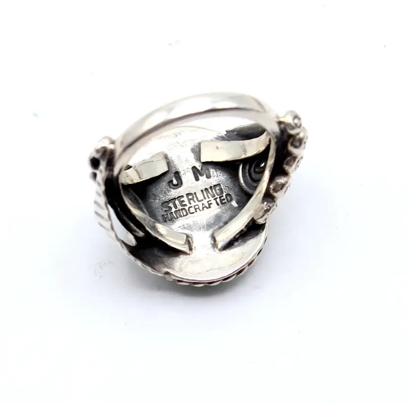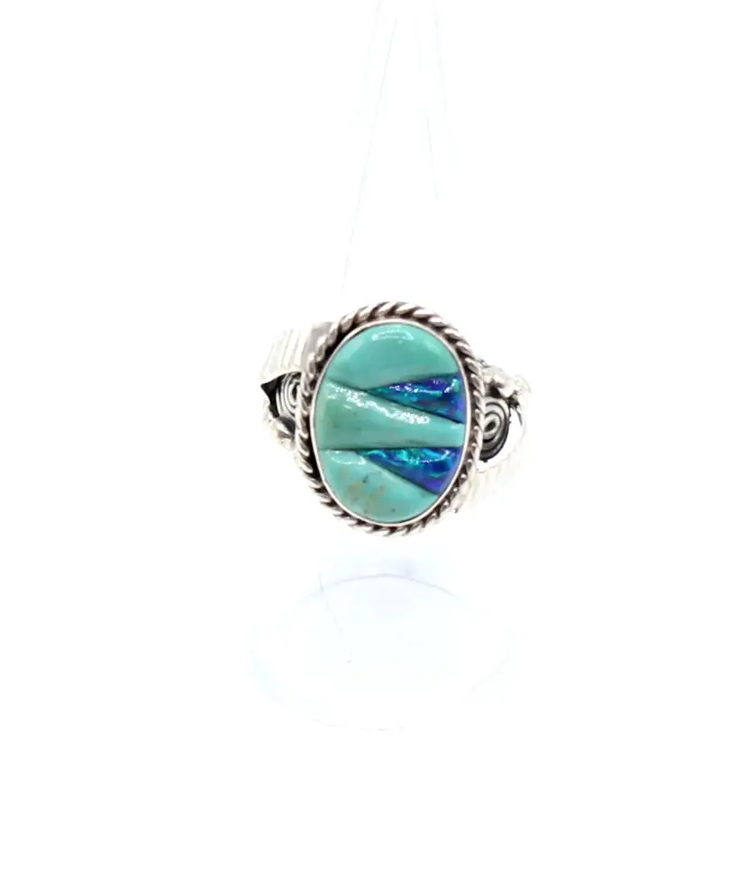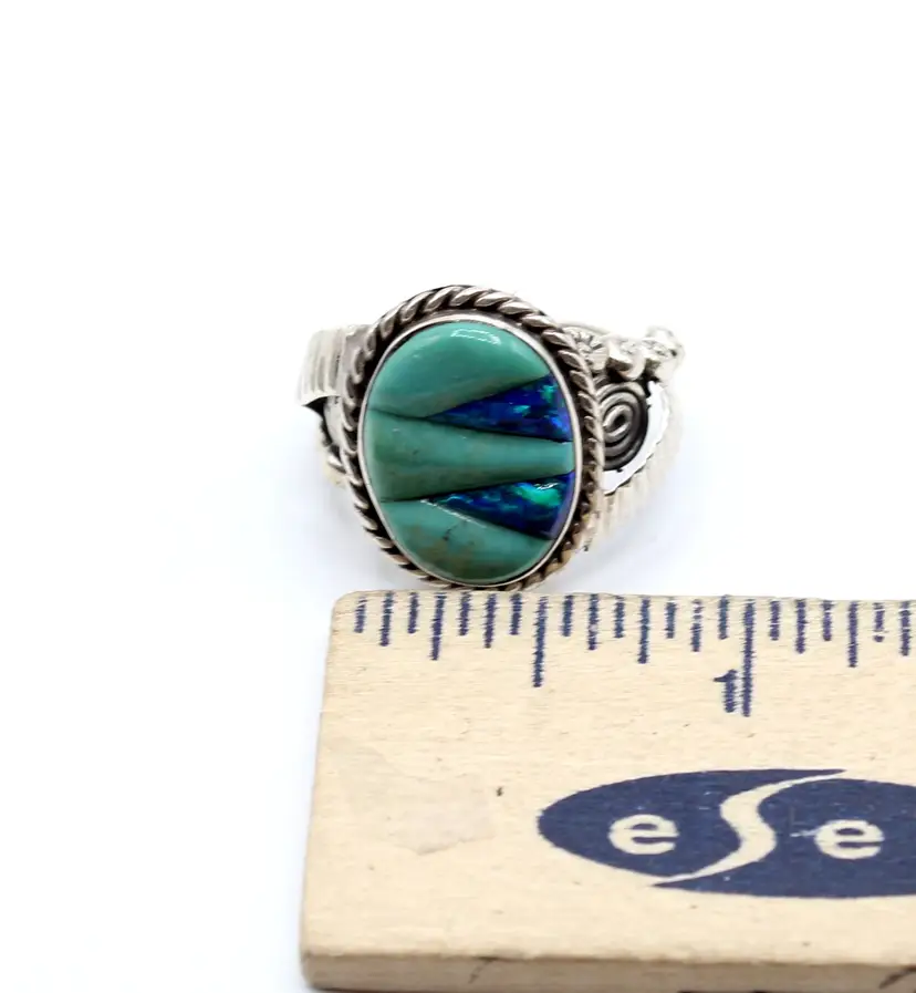 Beautiful signed JM inlay ring. Green turquoise with inlay of blue opal, set in a smooth bezel and twisted wire, with a detailed hand stamp 2.9mm band. Stone size approx 18mm x 13.5mm