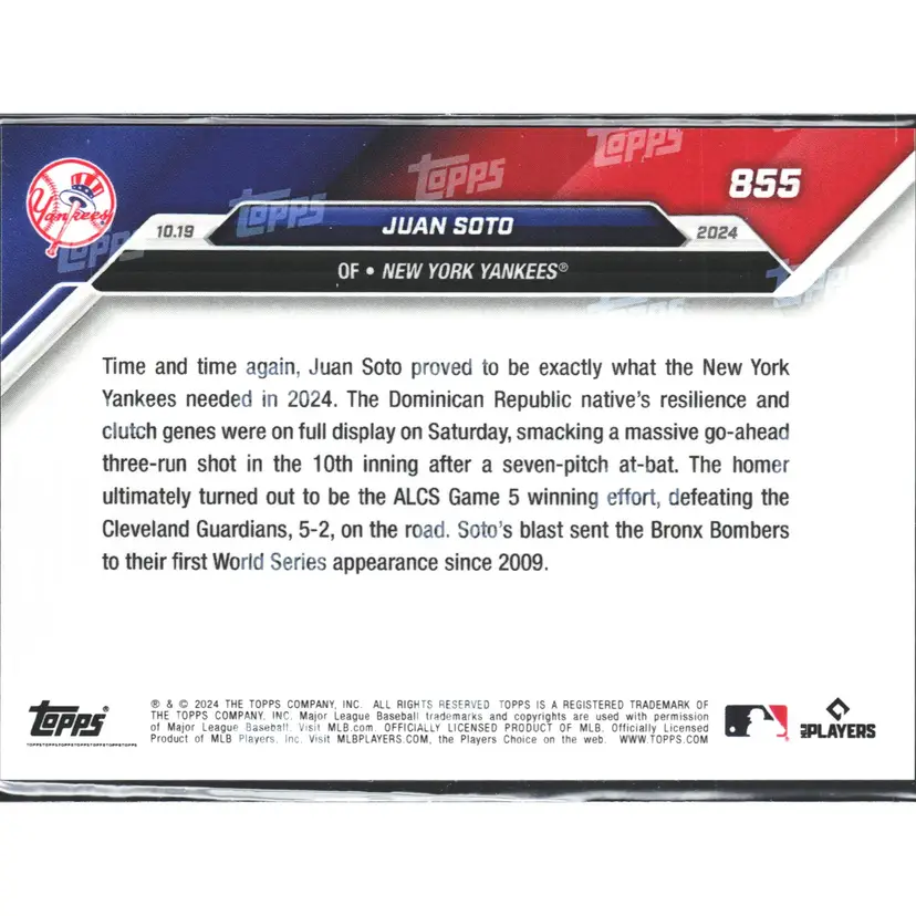 Use code DISTRICT5 at checkout to get $5 Off your 1st purchase of $10 or more! Celebrate Juan Soto's epic home run that sent the Yankees to the World Series with this 2024 Topps Now card. A must-have for any Yankees fan! US Shipping: $1.50 PWE for 1st item; $.25 for each additional item added to order.