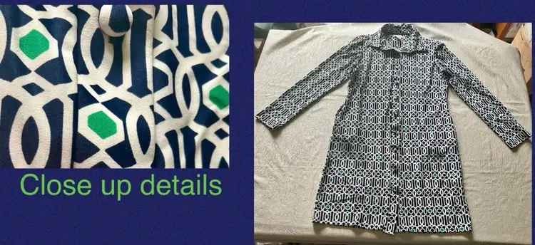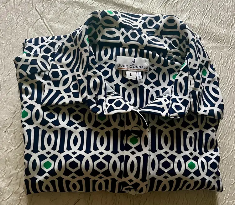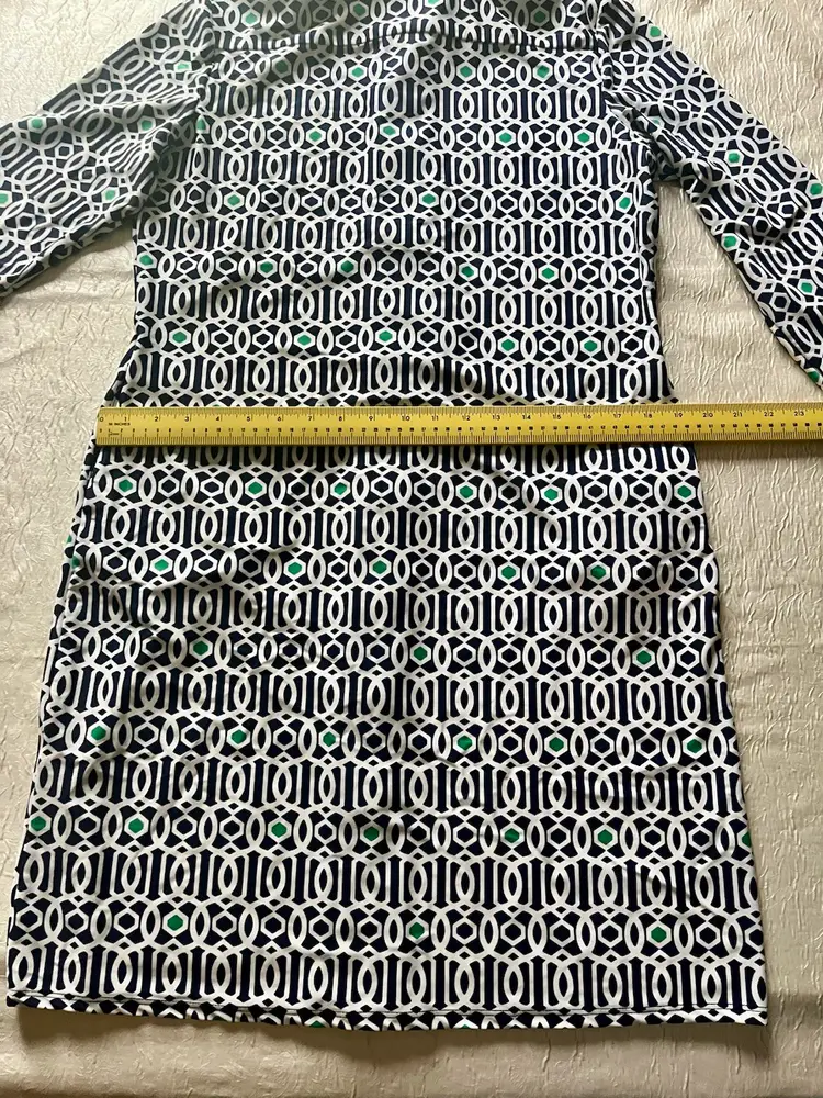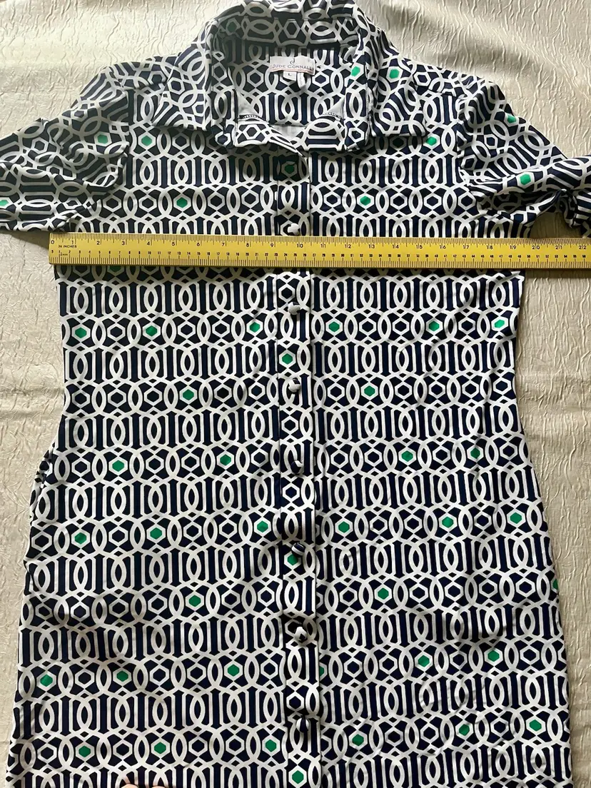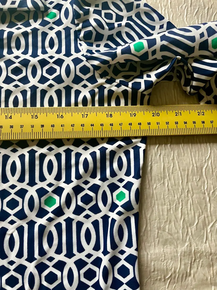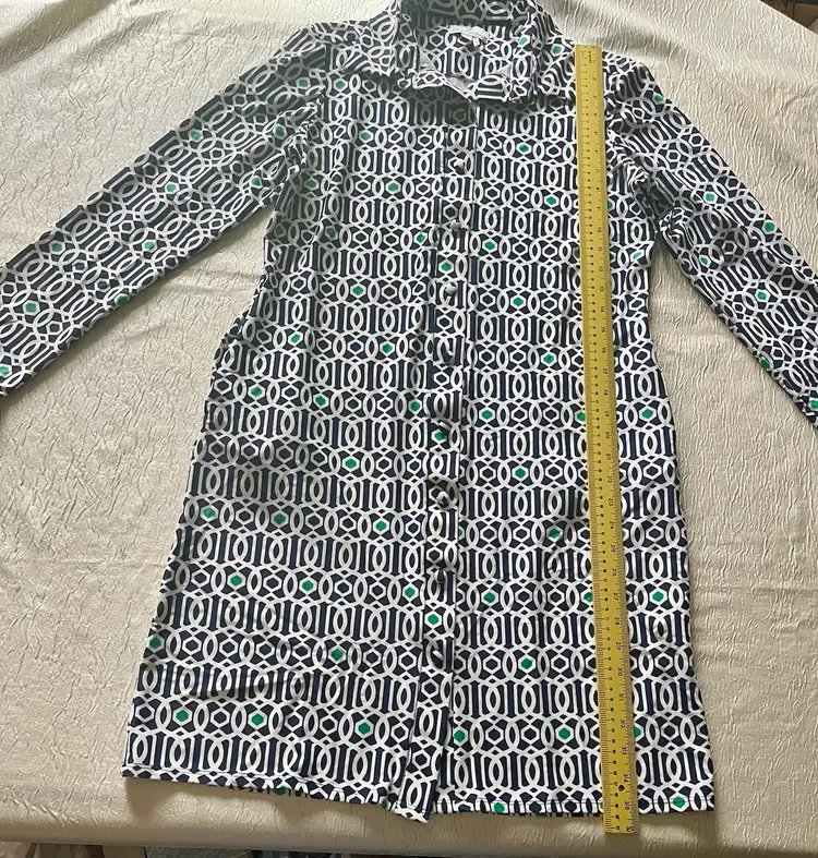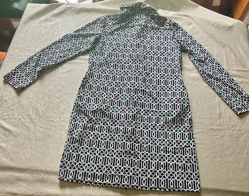 This Jude Connally shift dress is perfect for any occasion, whether you're traveling, in business mode, or out for a casual day. The dress features a beautiful geometric chain pattern in dark blue and white with accents of green and a comfortable covered buttoned front moving into a V-neckline and long sleeves. The dress is made of a combination of nylon and spandex, making it so incredibly soft, stretchy, packable, and non-wrinkle.