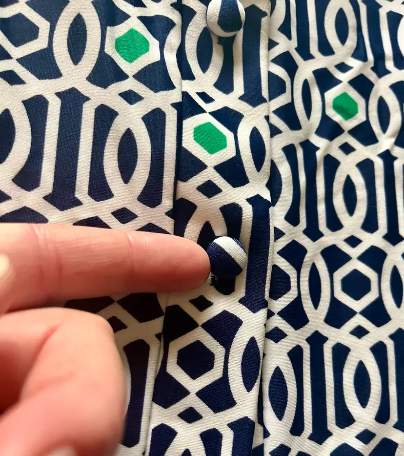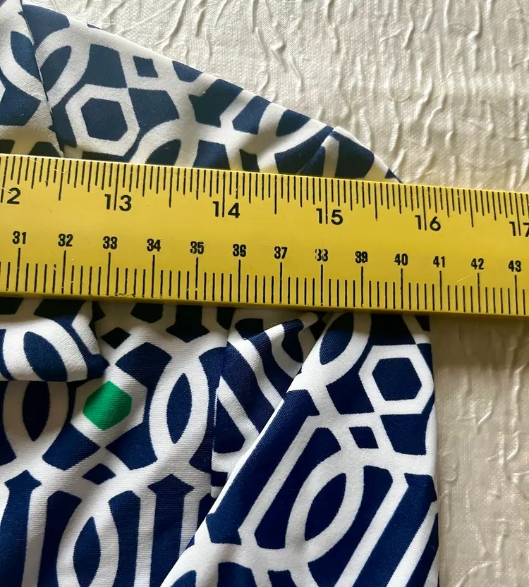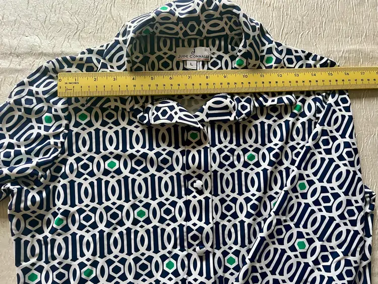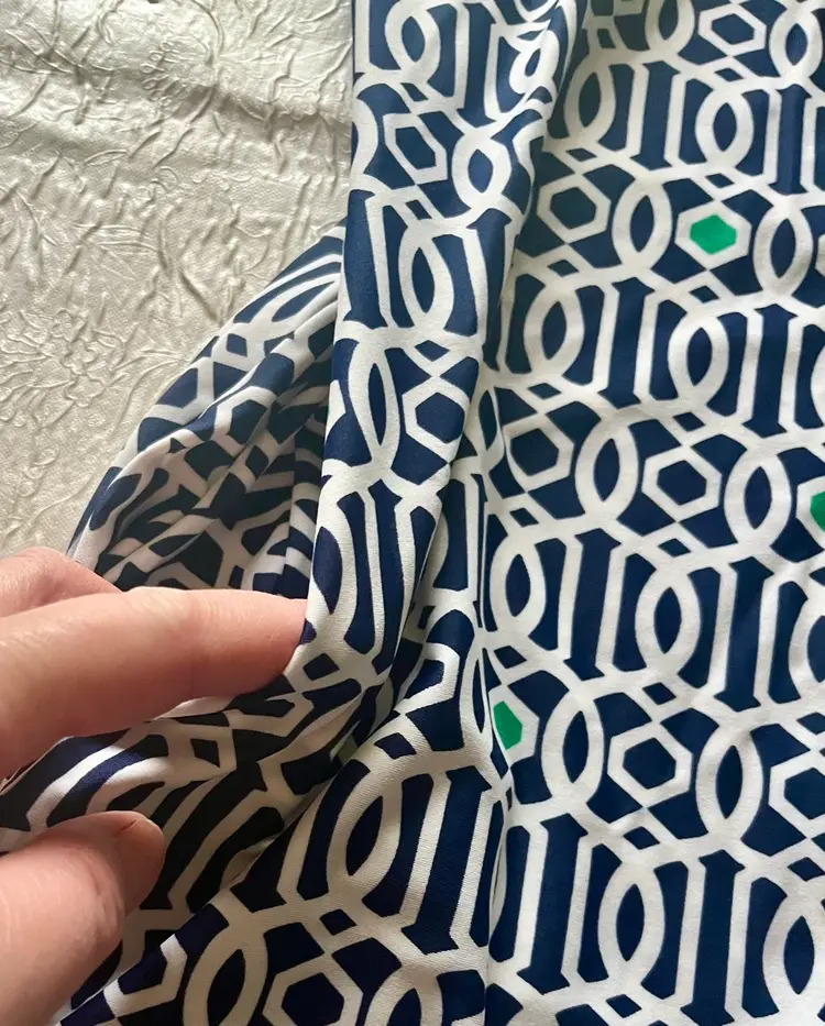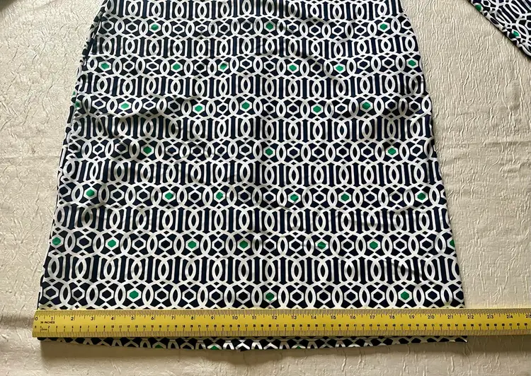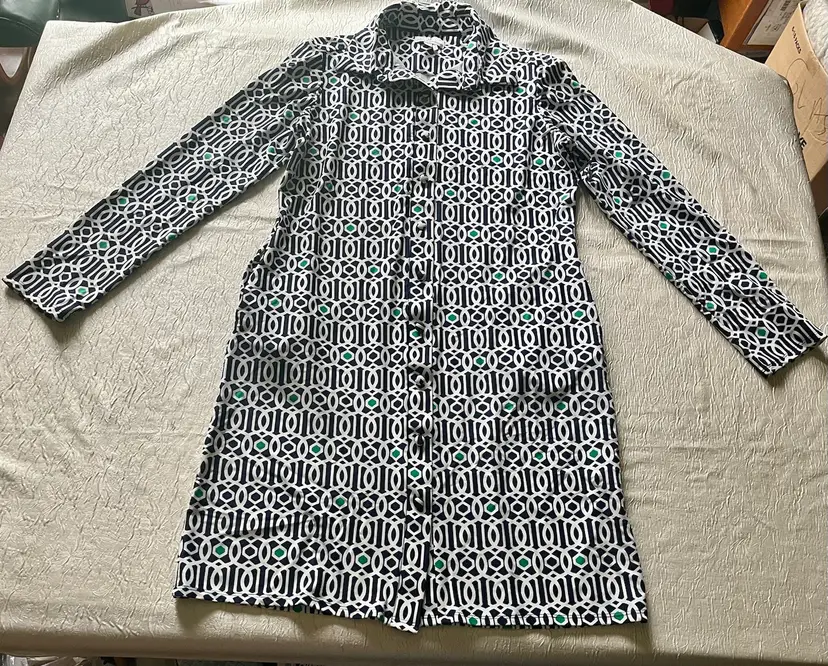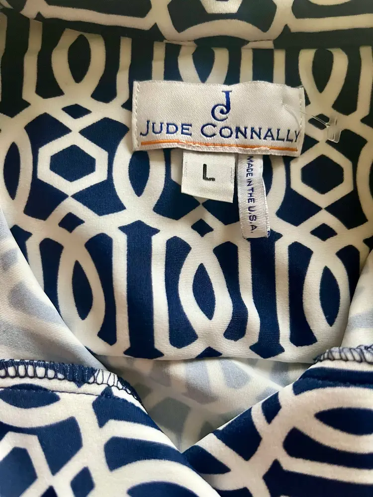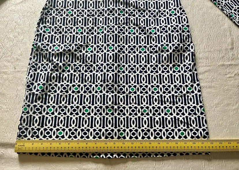 This Jude Connally shift dress is perfect for any occasion, whether you're traveling, in business mode, or out for a casual day. The dress features a beautiful geometric chain pattern in dark blue and white with accents of green and a comfortable covered buttoned front moving into a V-neckline and long sleeves. The dress is made of a combination of nylon and spandex, making it so incredibly soft, stretchy, packable, and non-wrinkle.